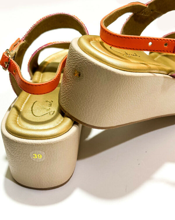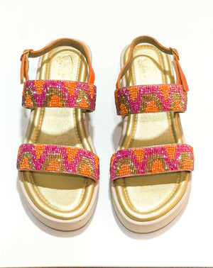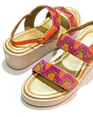 The Aztec Summer sandals are an exquisite blend of vibrant design and luxurious style. These sandals boast a glamorous gold platform heel that provides both height and a touch of sophistication. The standout feature is the two straps that secure the foot, each adorned with an intricate Aztec print. This eye-catching pattern is meticulously crafted using beads in shades of pink, orange, and gold, creating a dynamic and colourful look that is rich in detail and cultural inspiration. The combination of the dazzling gold platform heel and the vivid beaded straps makes the Aztec Summer sandals a perfect choice for adding flair and elegance to any outfit, ideal for summer outings and special occasions.