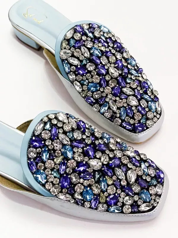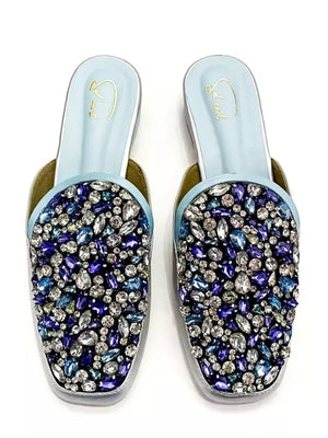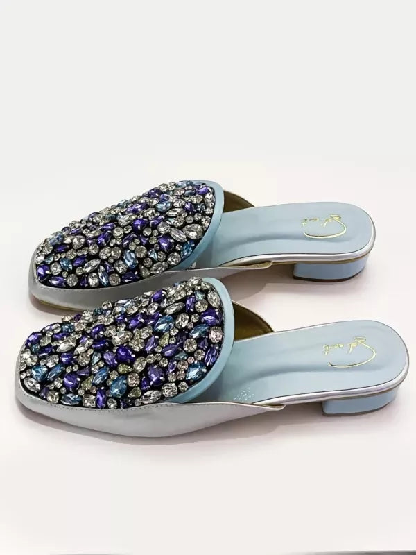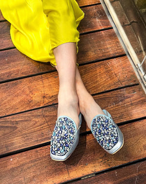 Step into a world of enchantment with the ‘Azurite’ mules, where every facet tells a tale of elegance and sophistication. Crafted with a lustrous silver base that reflects the light with a celestial glow, these mules exude an aura of refined luxury. The azure blue sole mirrors the depth of the ocean, inviting you to embark on a journey of timeless allure. But it’s the intricate detailing that truly captivates the eye and heart. Each mule is adorned with a mesmerising array of embroidered stones in shades of sapphire, cerulean, and aquamarine, reminiscent of the ocean’s ever-changing hues. Interspersed among them are delicate white crystals that shimmer like scattered pearls upon the water’s surface, adding a touch of ethereal beauty to every step. With every stride, feel the weight of the world lift as you are transported to a realm of serenity and grace. These mules are not merely footwear—they are a work of art, a testament to the exquisite craftsmanship and timeless elegance that defines true luxury. Embrace the magic of ‘Azurite’ and let your style speak volumes as you dance through life with effortless grace and poise.
