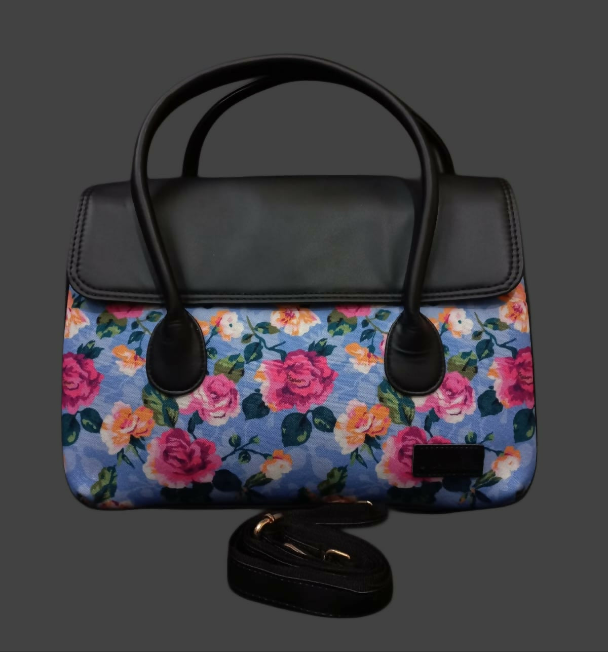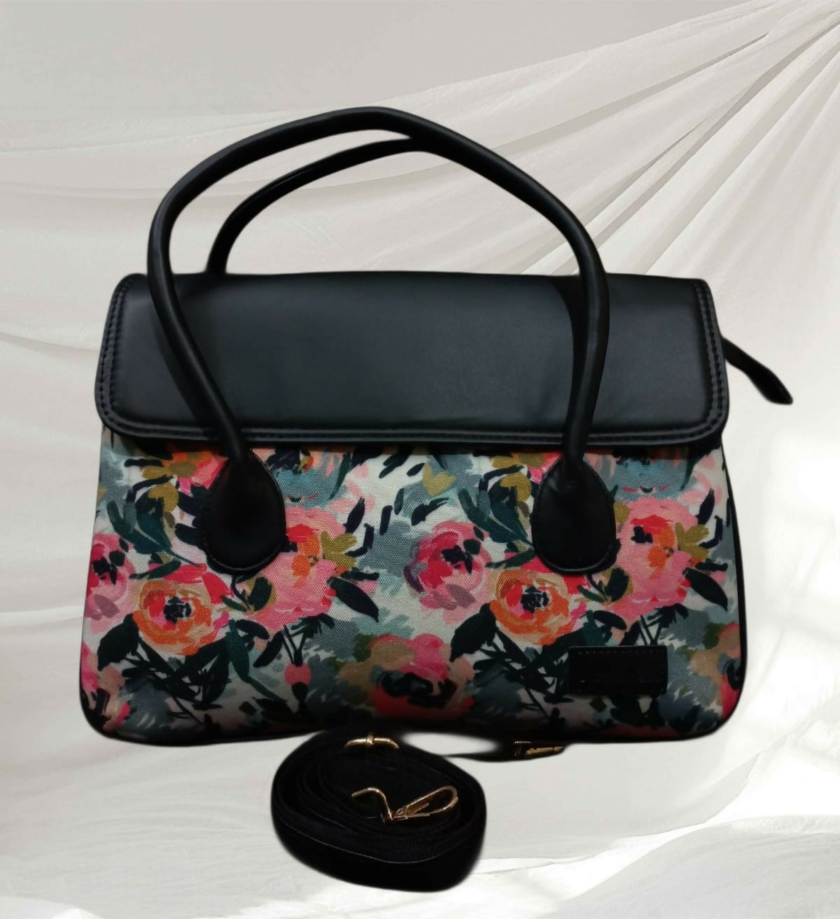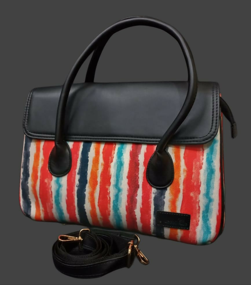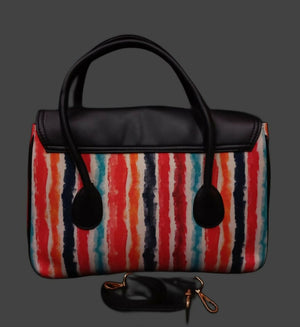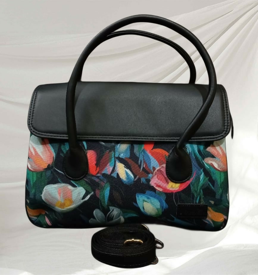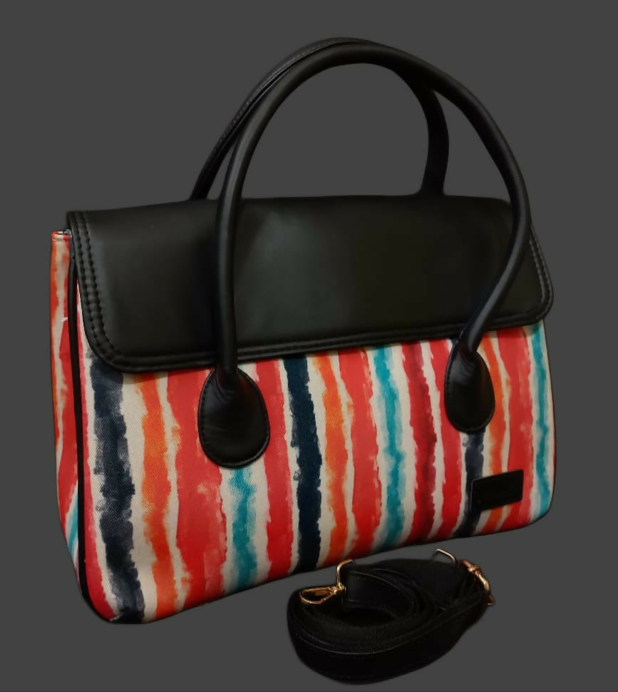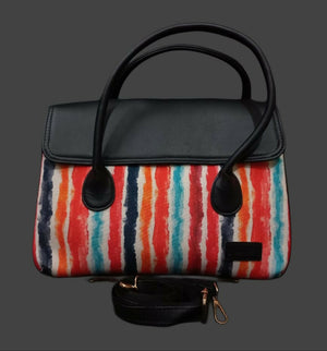 A stylish handheld sling bag featuring attractive prints paired with a sleek black flap and sturdy handles. Designed to stand out while staying elegant, it’s perfect for casual outings, workdays, or festive occasions.