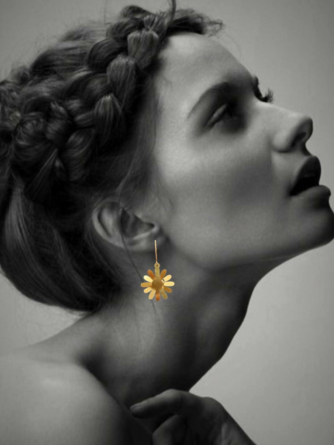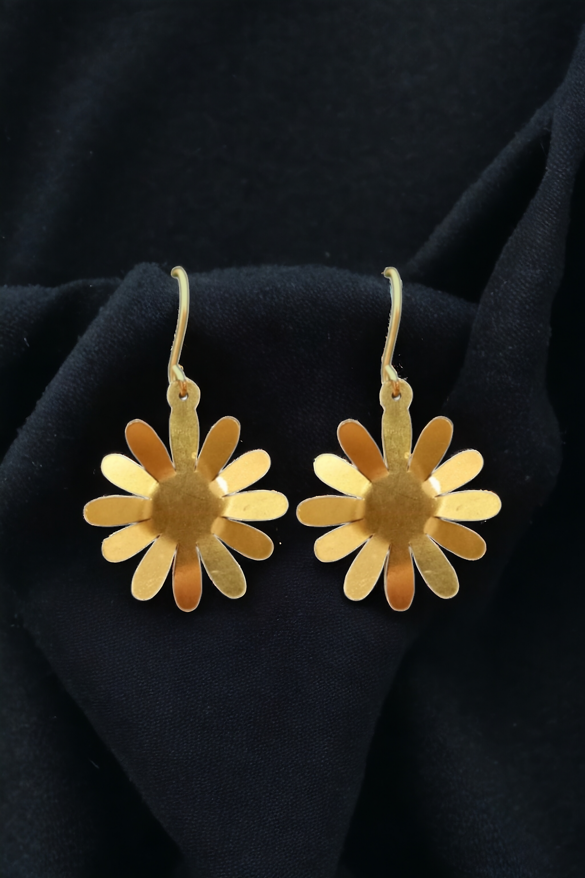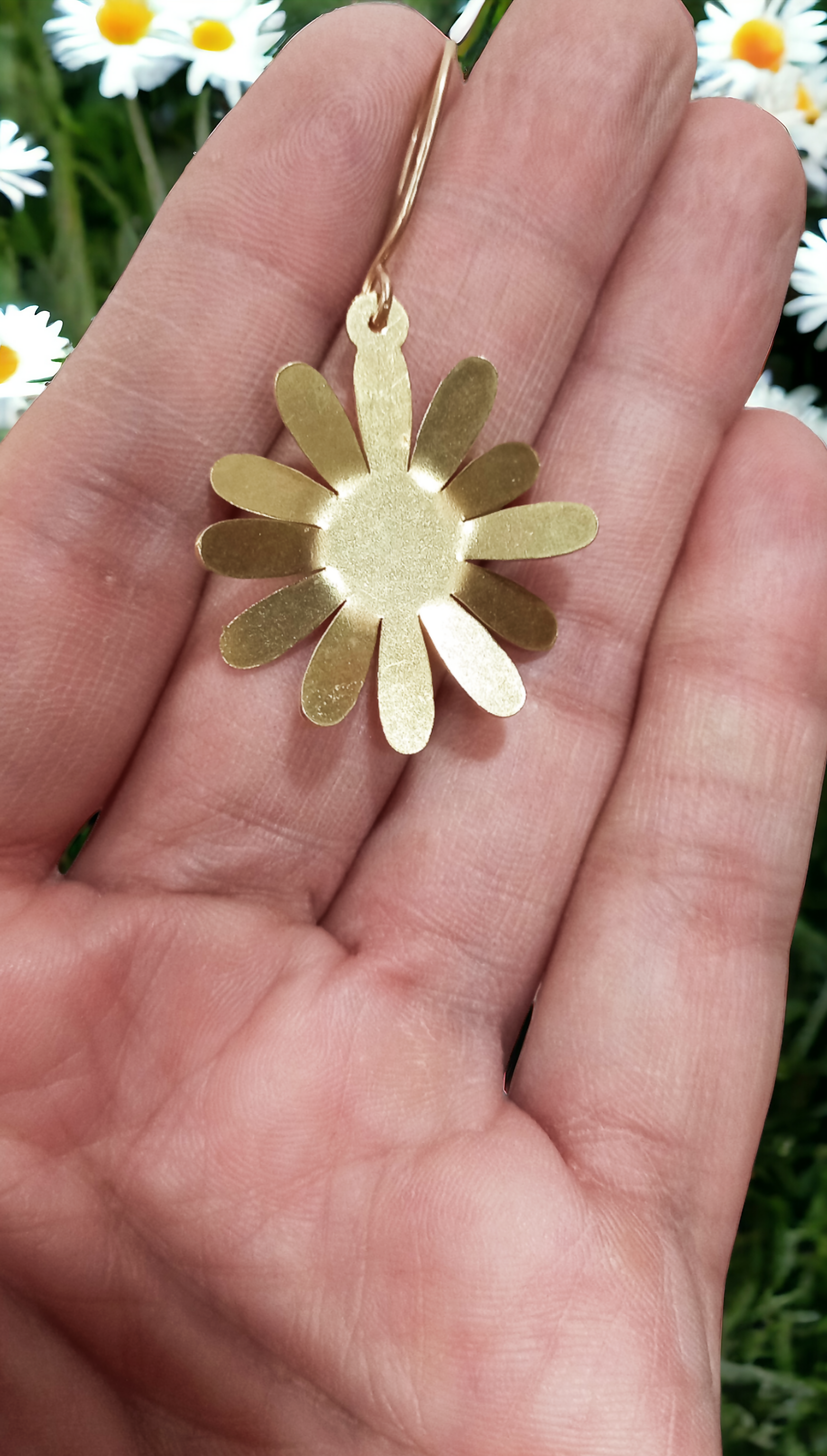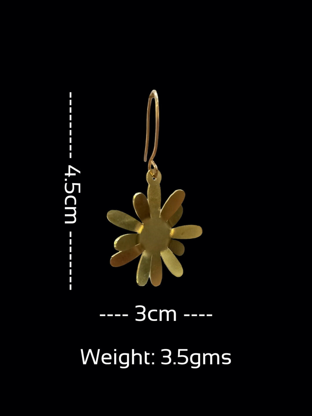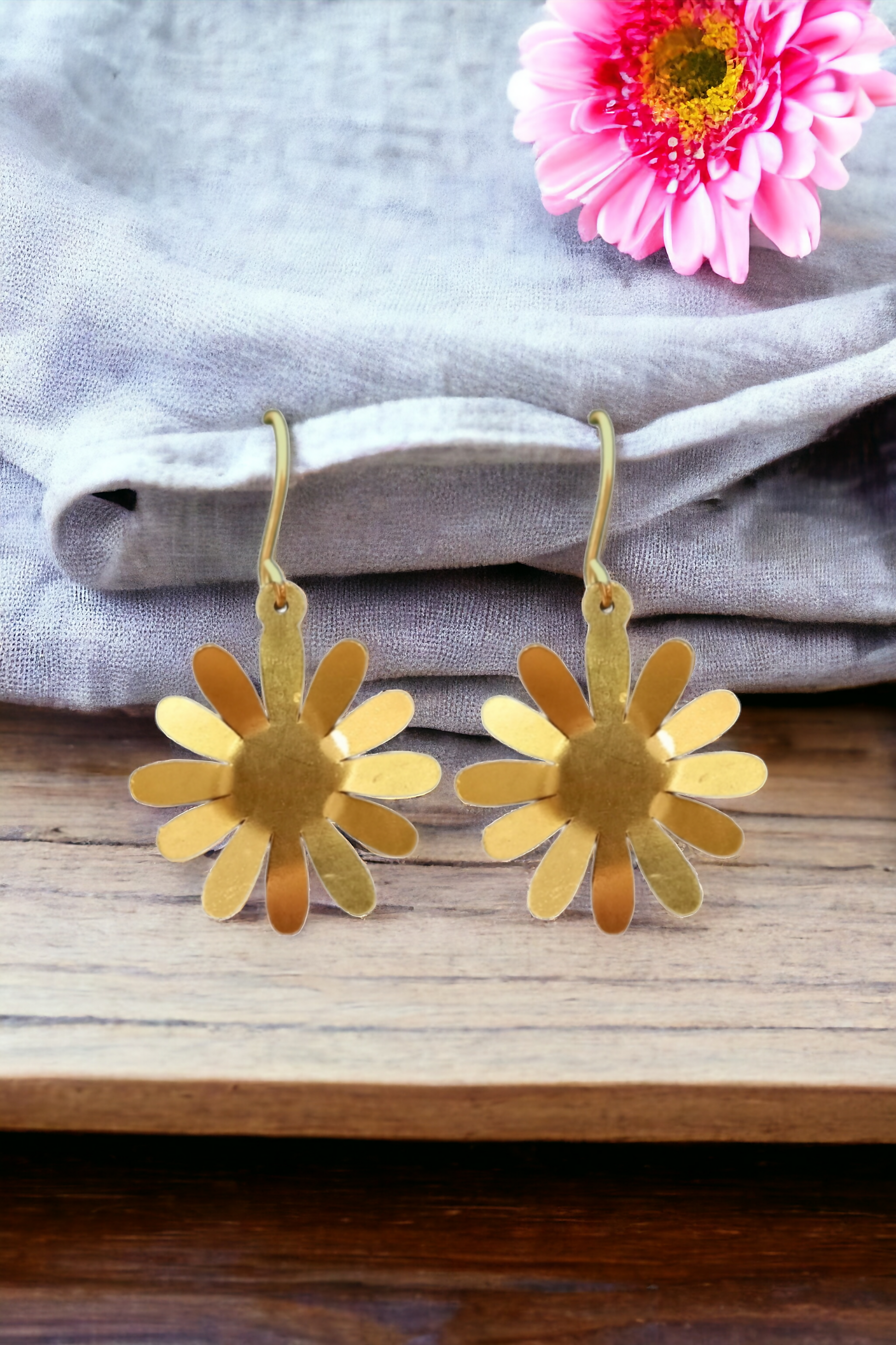 Daisy Shaped Earrings: Charming earrings meticulously crafted from gleaming brass, each one a delightful homage to the cheerful daisy flower. The earrings capture the essence of these blooms with intricate detail, their dainty forms evoking the whimsy of a sun-kissed meadow in full bloom. The raw brass material lends a warm, golden glow to the earrings, accentuating the delicate curves and contours of the daisy petals. Each petal is finely sculpted, creating a lifelike representation of the flower in miniature. Wearing these daisy-shaped brass earrings is like adorning yourself with a symbol of simplicity and natural beauty. They're perfect for adding a touch of floral charm to any outfit, whether for a casual day out or a special occasion in the sunshine.