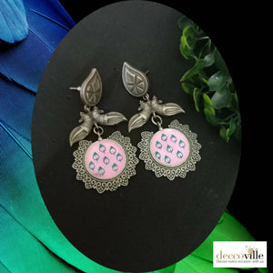 Enamel and Peacock Motifs embellished, nature inspired earrings made from brass, wear the oxidized silver-plated pair with any of your outfit Available in three colors.