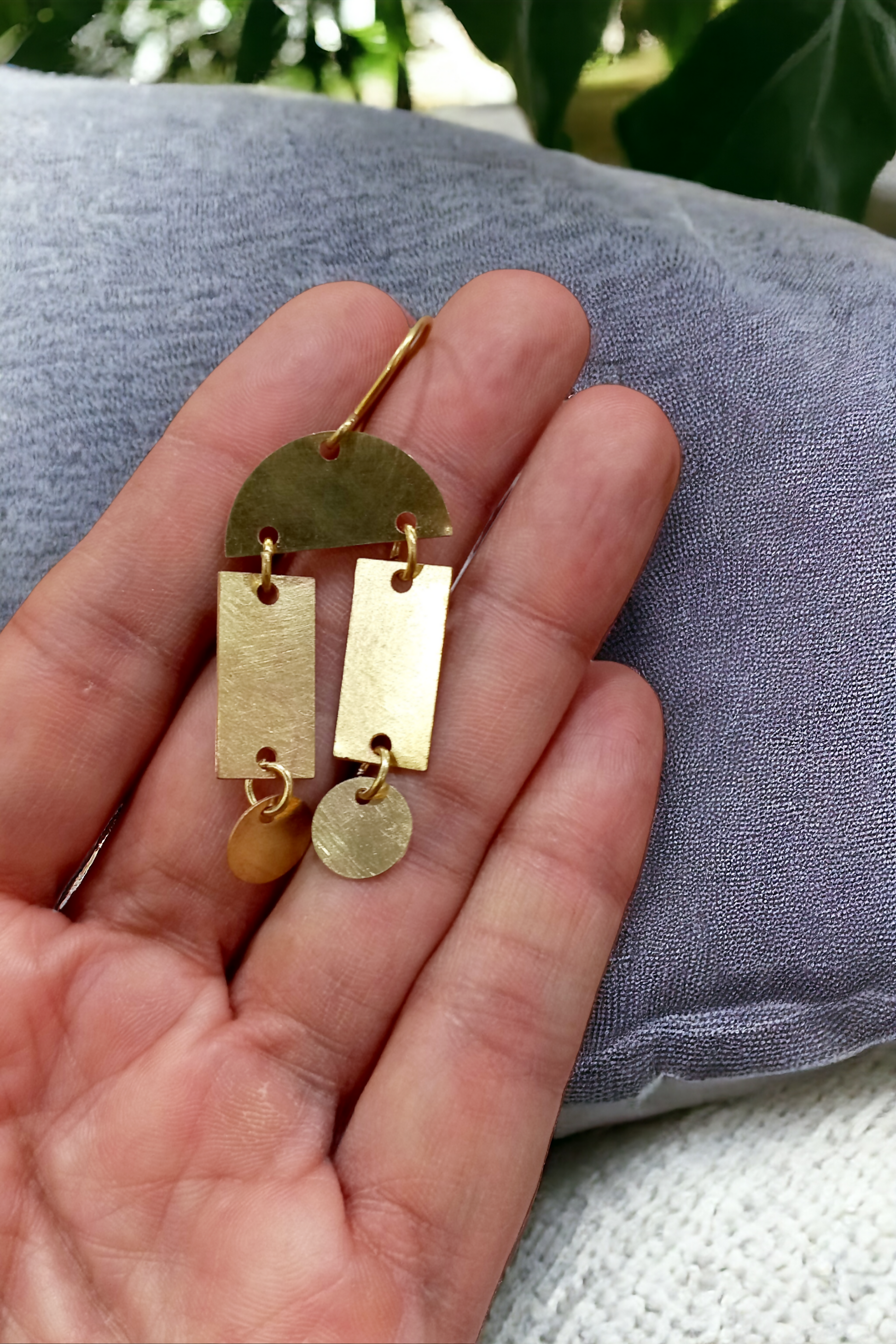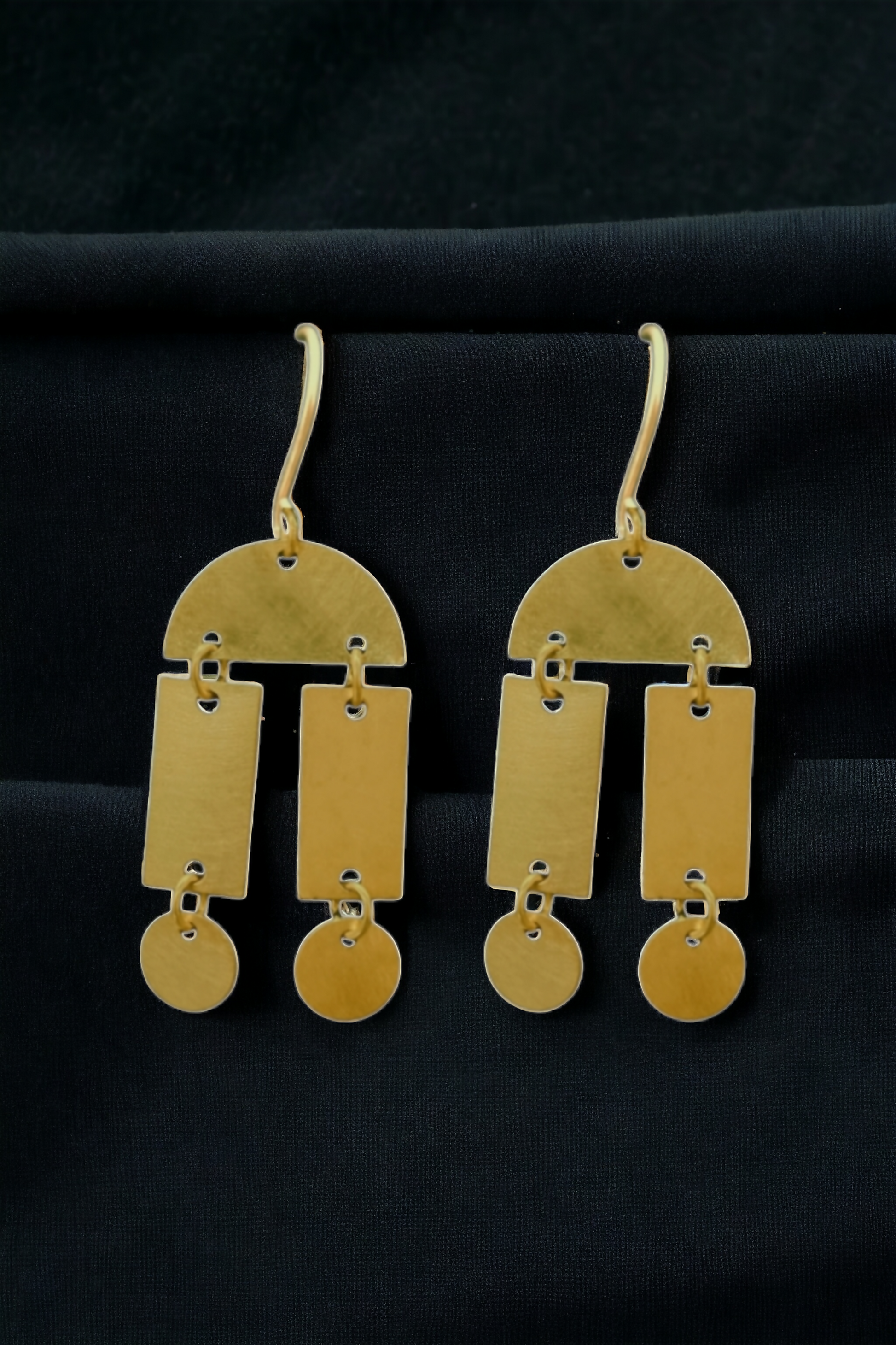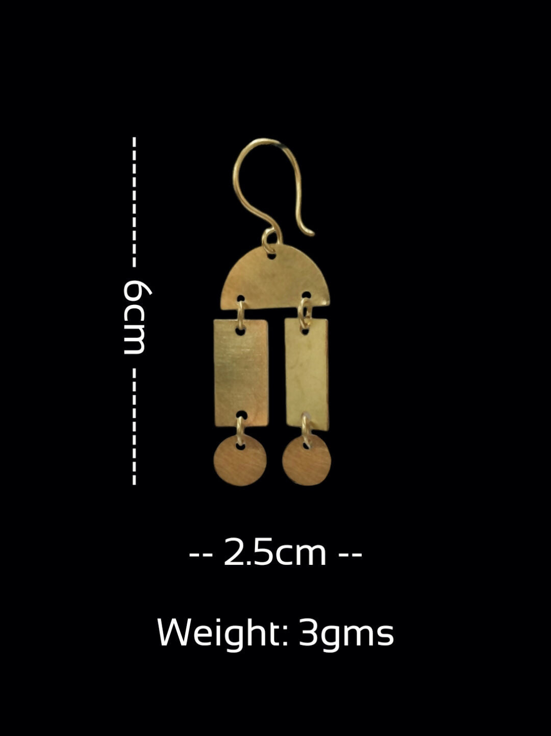 Geometric Earrings: Elevate your style with these striking geometric-shaped brass earrings, a fusion of elegance and modernity. Crafted with precision, each earring showcases a captivating interplay of angles and curves, exuding a timeless charm. The geometric design features clean lines and sleek contours, creating a captivating silhouette that catches the light with every movement. Lightweight yet durable, they offer comfort for all-day wear without compromising on style. Make a statement with these versatile earrings, perfect for adding a touch of flair to both casual and formal looks. Whether you're attending a brunch with friends or a soirée under the stars, these brass earrings are sure to turn heads and spark conversation wherever you go.