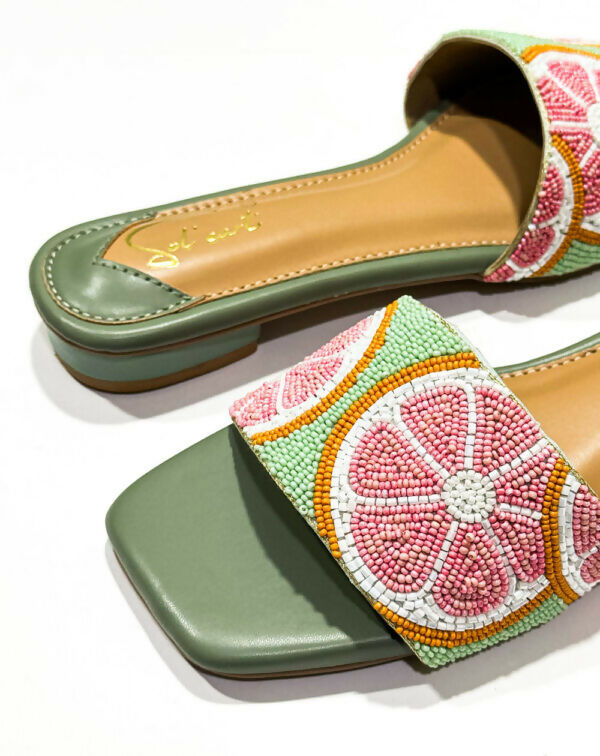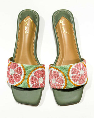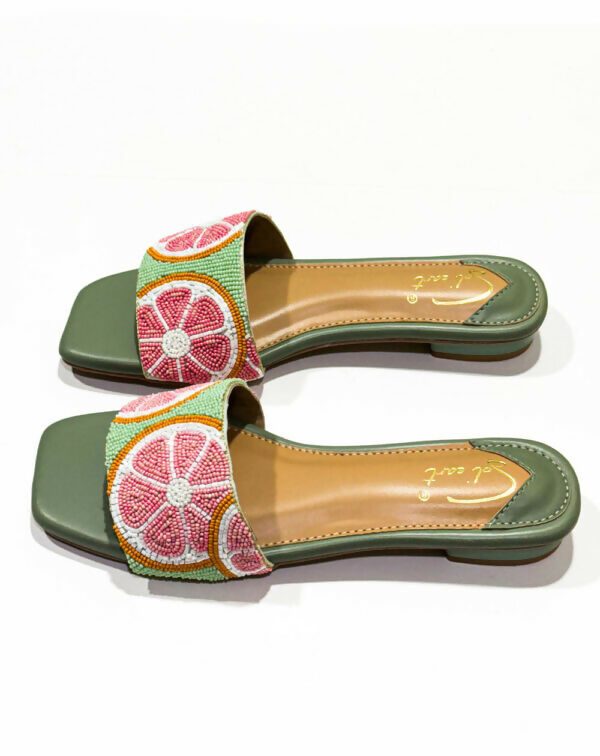 The Grapefruit Burst sliders are a stylish and refreshing footwear choice. They feature an earthy green base that provides a grounded and eye-catching foundation. The upper part of these sliders is beautifully embroidered and adorned with intricate beadwork, forming a design of a sliced grapefruit. The grapefruit is depicted in beads of pink and white, adding a playful and detailed touch to the overall aesthetic. Completing the design is a tan sole, which offers a subtle contrast to the vivid green base and complements the colourful upper. These sliders are perfect for adding a pop of colour and fun to any casual outfit.