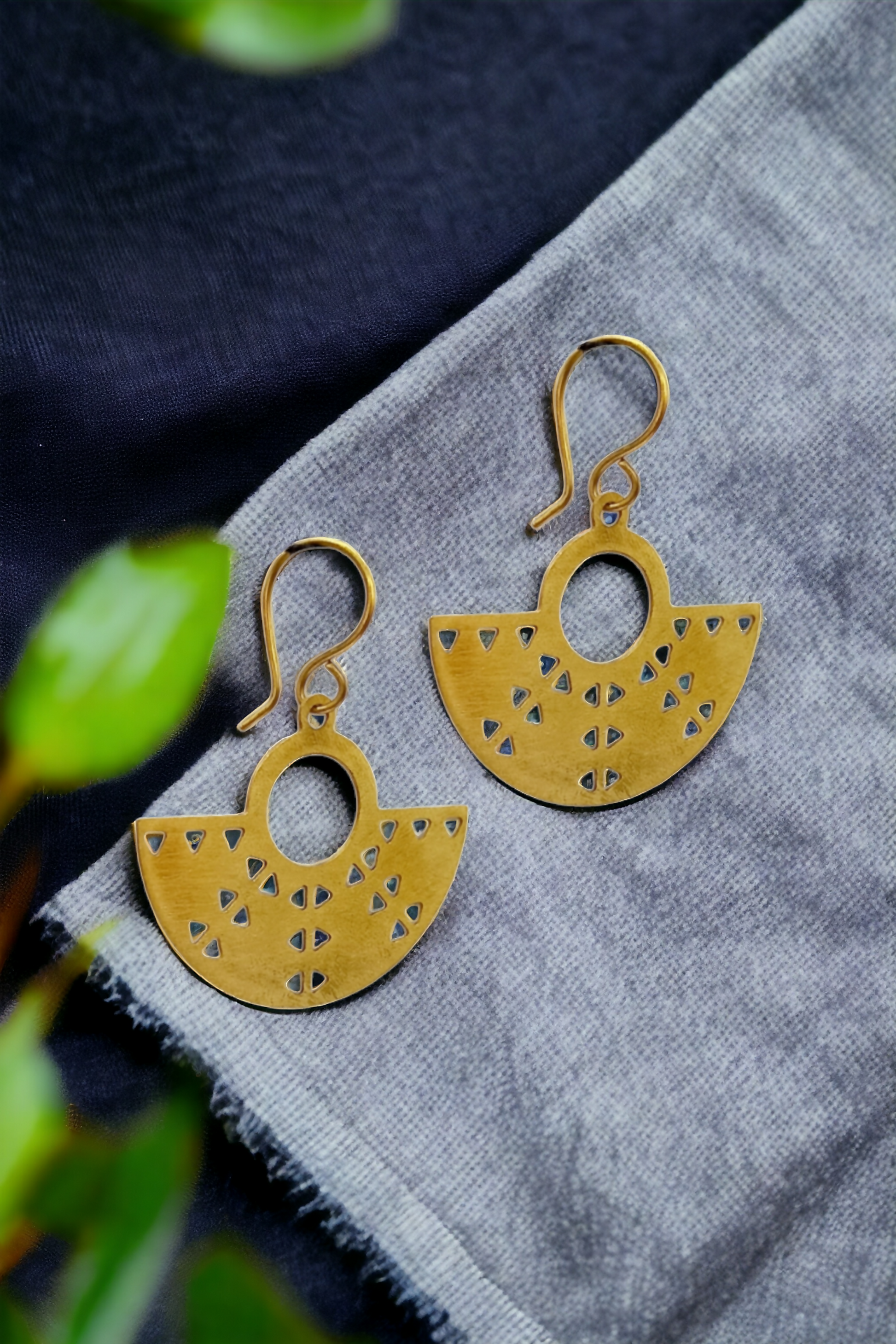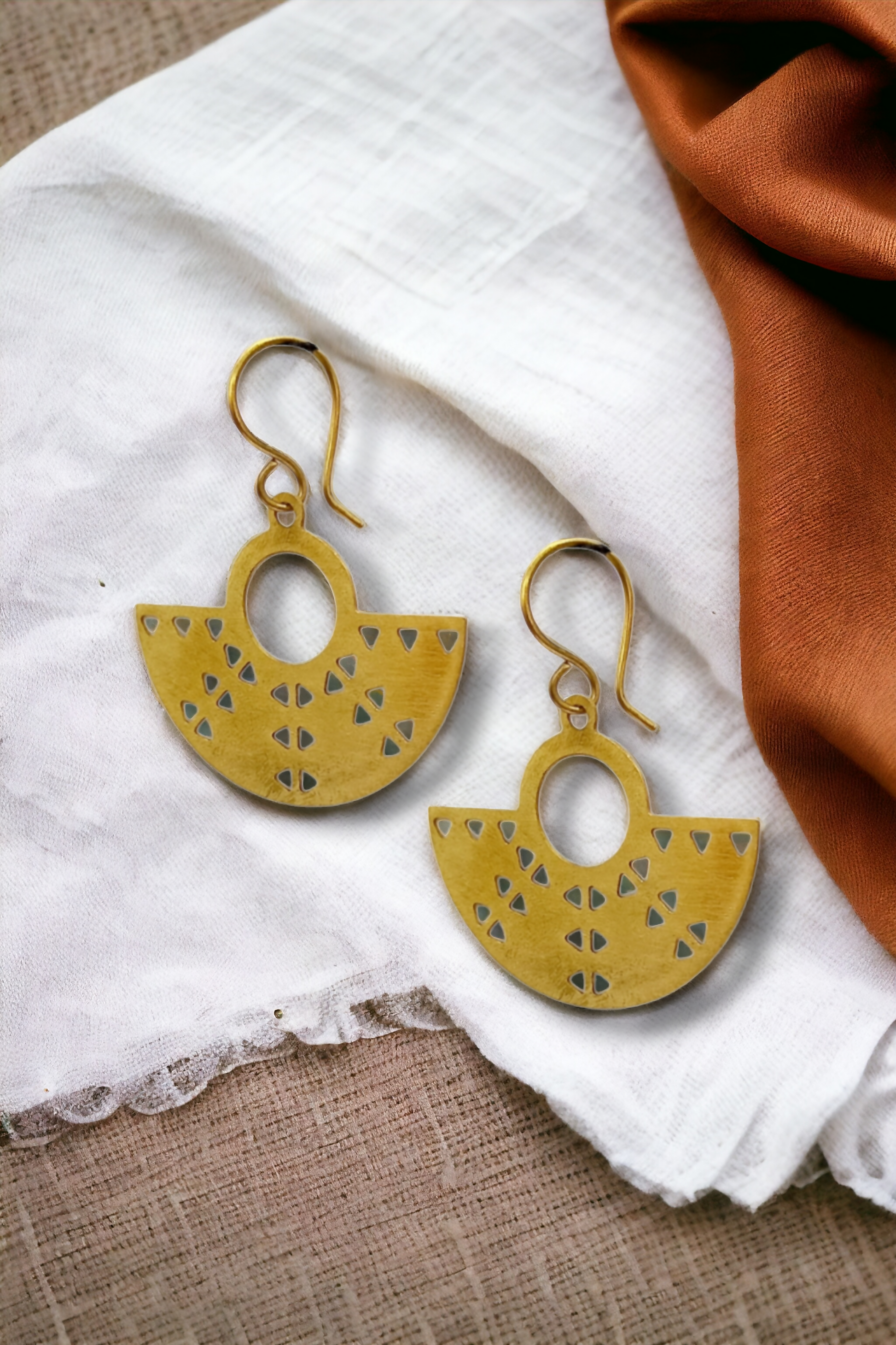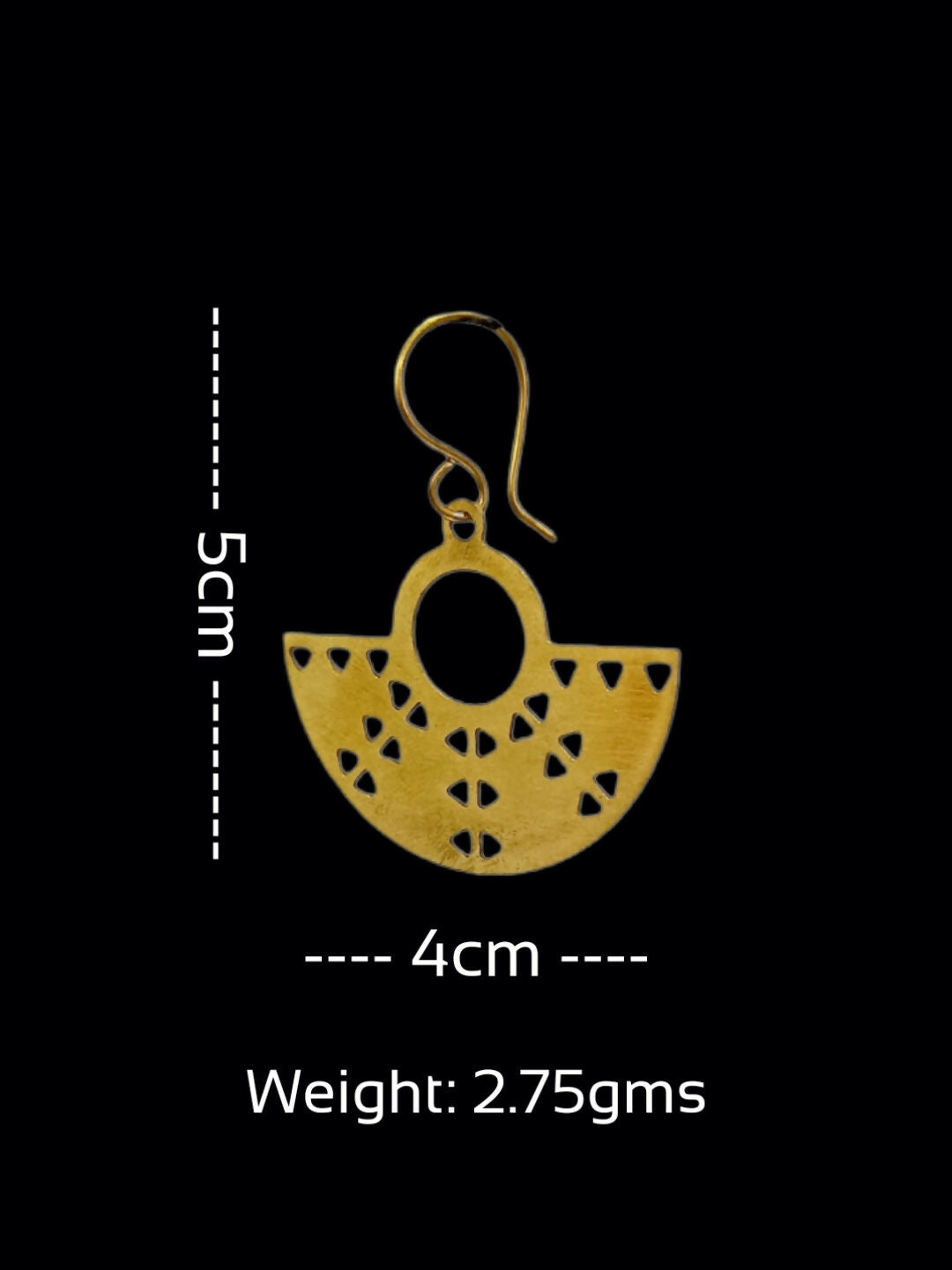 Half Round Nakshi Earrings: Elegant earrings meticulously crafted from polished brass, each one adorned with a mesmerizing Nakshi design that evokes the richness of tradition and culture. The semi-circular shape of the earrings offers a contemporary twist, while the intricate Nakshi pattern infuses them with timeless charm. The raw brass lends a radiant, golden hue to the earrings, enhancing the intricate details of the Nakshi design. Delicate motifs, inspired by traditional craftsmanship, adorn the surface, creating a mesmerizing tapestry of cultural heritage. Wearing these semi-circular brass earrings with Nakshi design is like carrying a piece of artistic legacy with you, a symbol of heritage and elegance. They're perfect for adding a touch of cultural flair to any ensemble, whether for a formal event or a casual outing where you want to make a statement.
