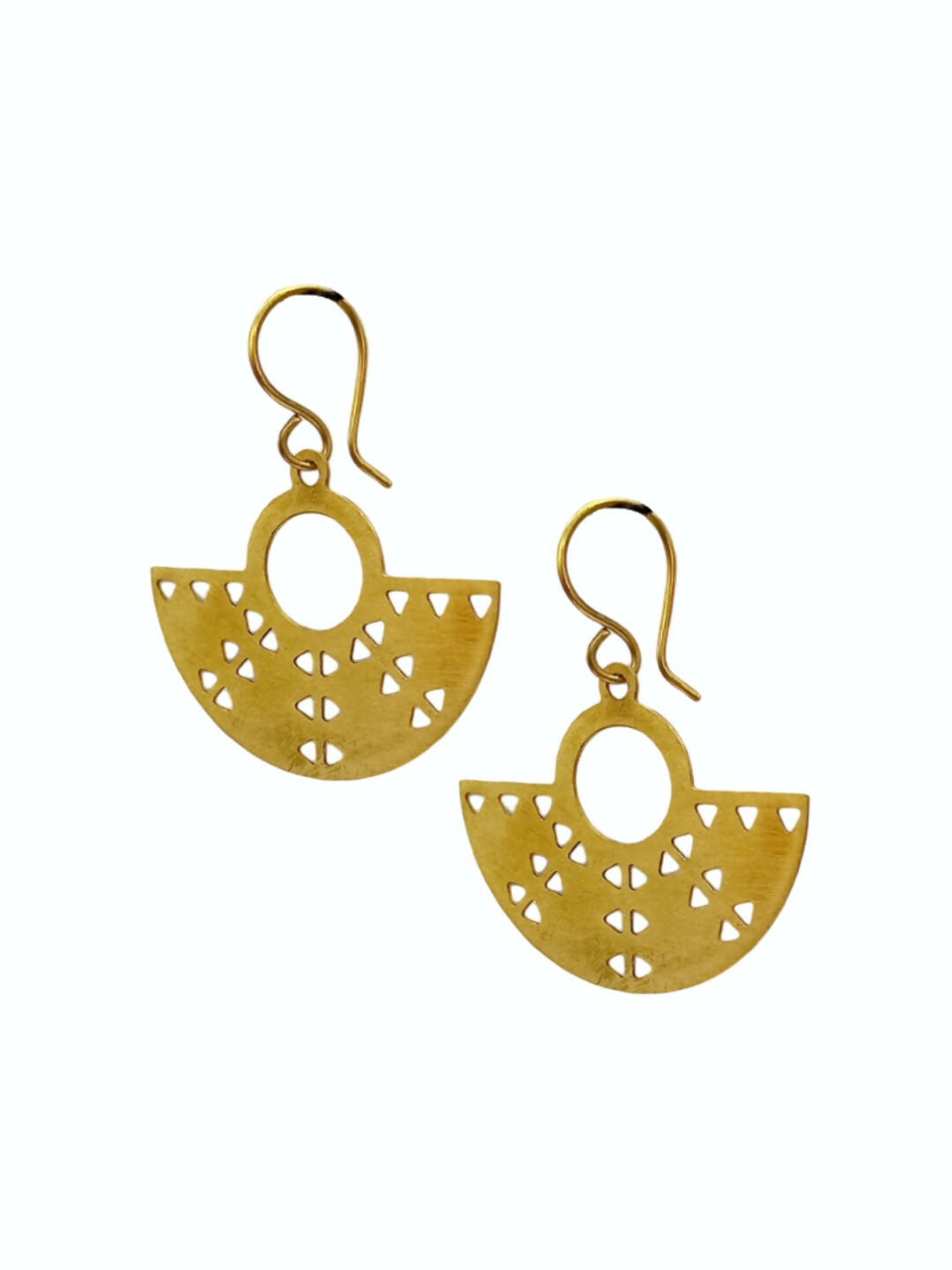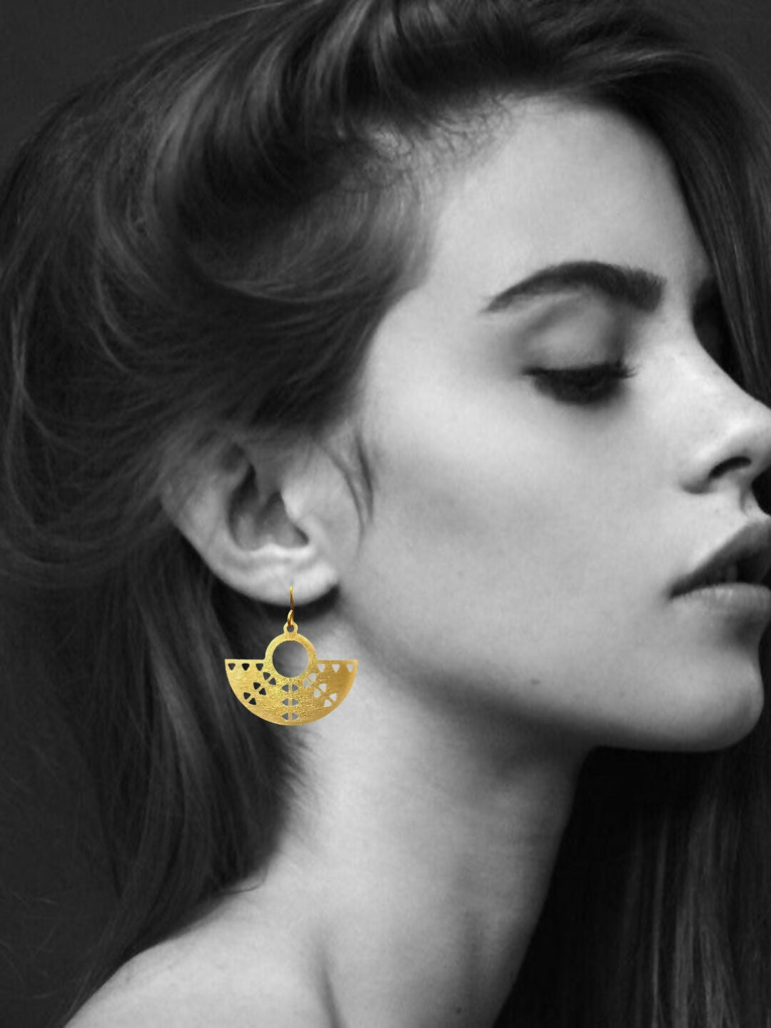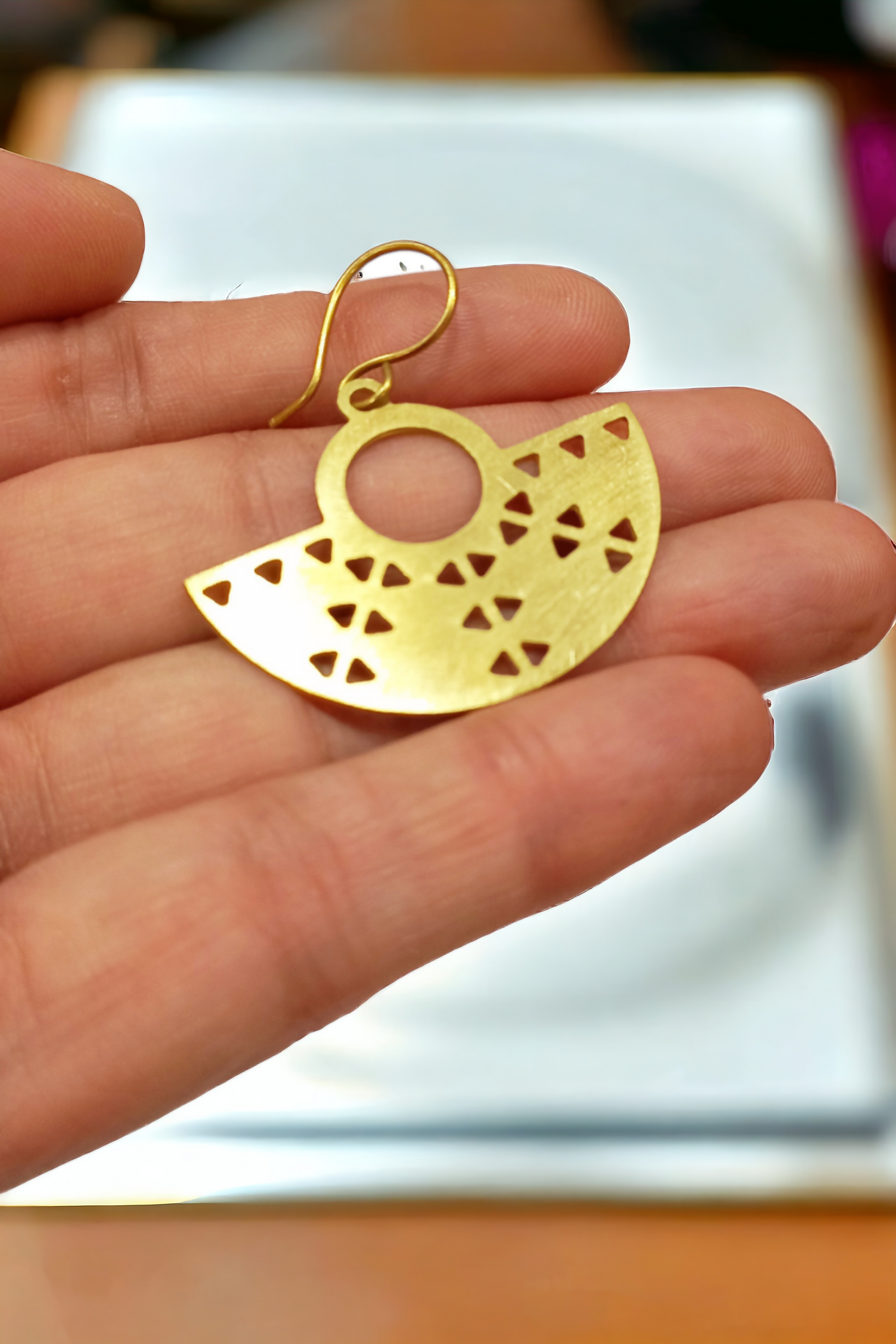 Half Round Nakshi Earrings: Elegant earrings meticulously crafted from polished brass, each one adorned with a mesmerizing Nakshi design that evokes the richness of tradition and culture. The semi-circular shape of the earrings offers a contemporary twist, while the intricate Nakshi pattern infuses them with timeless charm. The raw brass lends a radiant, golden hue to the earrings, enhancing the intricate details of the Nakshi design. Delicate motifs, inspired by traditional craftsmanship, adorn the surface, creating a mesmerizing tapestry of cultural heritage. Wearing these semi-circular brass earrings with Nakshi design is like carrying a piece of artistic legacy with you, a symbol of heritage and elegance. They're perfect for adding a touch of cultural flair to any ensemble, whether for a formal event or a casual outing where you want to make a statement.