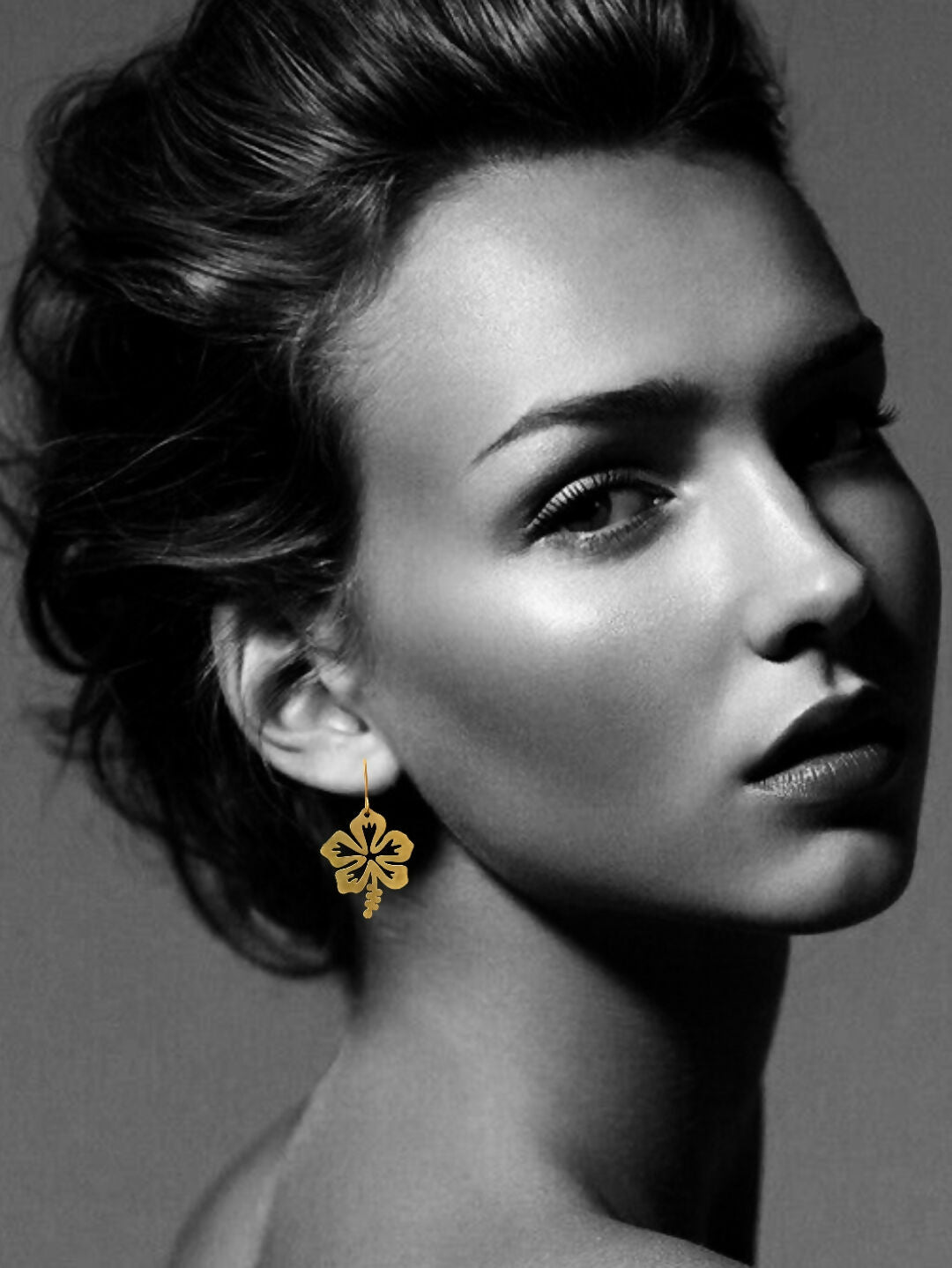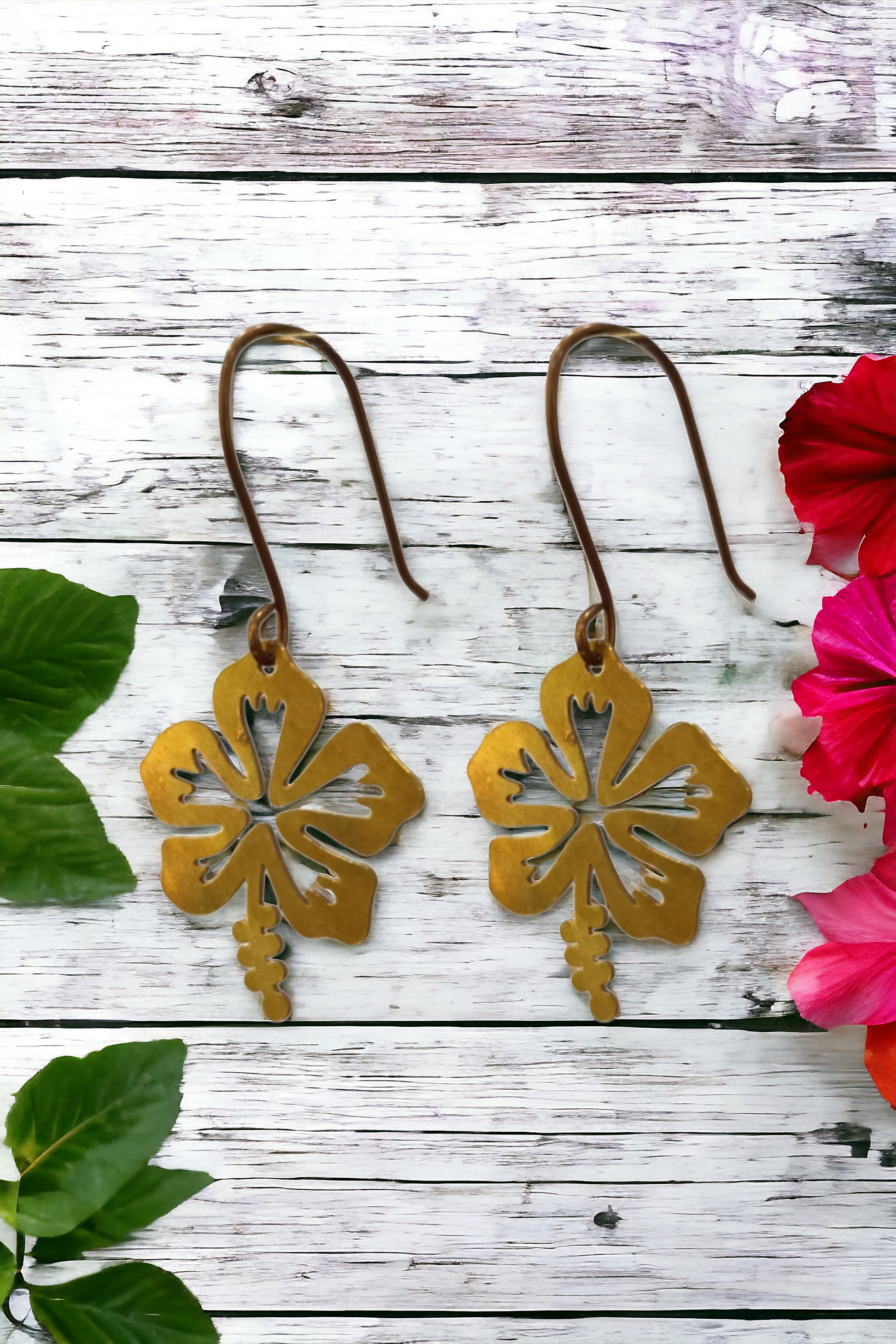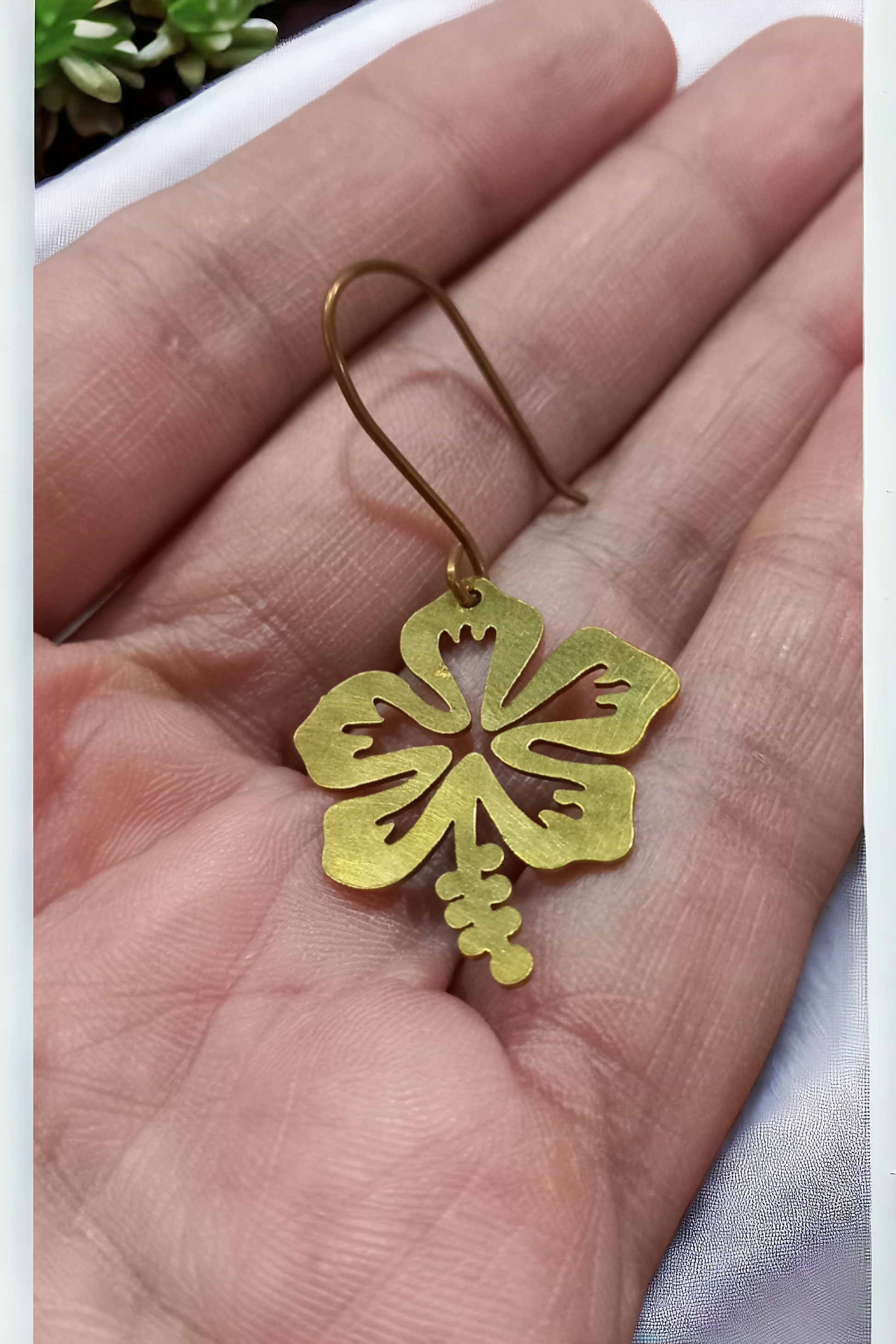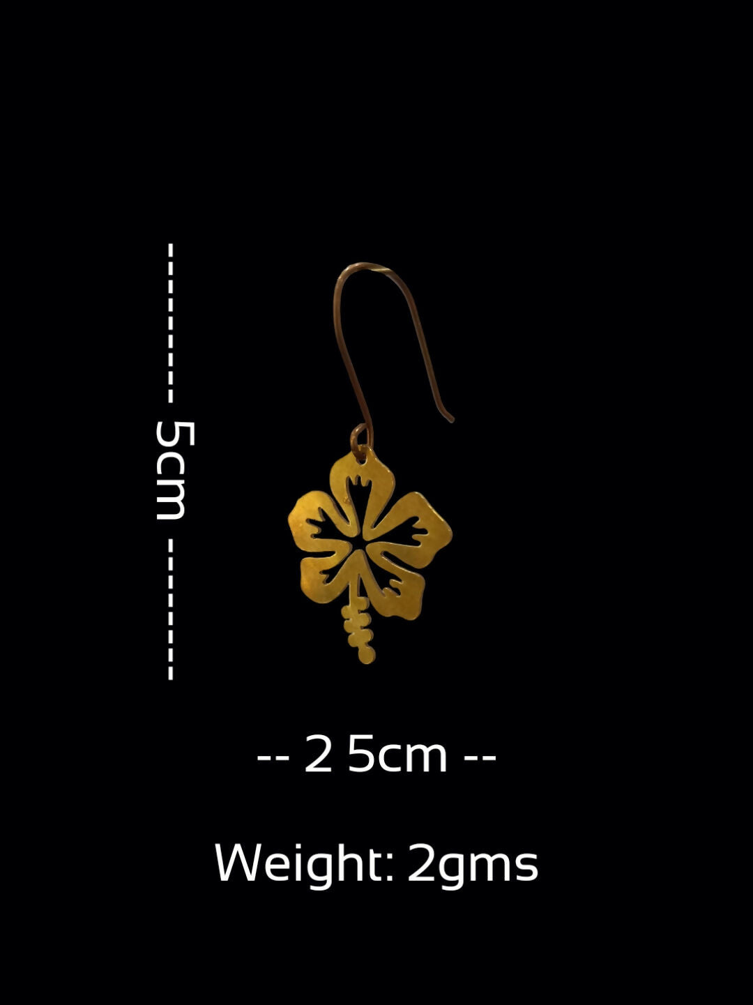 Hibiscus Earrings: Dainty earrings meticulously crafted from gleaming brass, each one an enchanting homage to the vibrant hibiscus flower. The delicate petals unfurl with grace, capturing the essence of the flower's natural beauty in exquisite detail. Wearing these hibiscus-shaped brass earrings is like adorning yourself with a symbol of tropical elegance and natural grace. They're perfect for adding a pop of botanical beauty to any outfit, whether for a sunny day out or an evening soirée under the stars. The raw brass material lends a warm, golden glow to the earrings, accentuating the intricate curves and contours of the hibiscus petals. Each petal is finely etched and sculpted, creating a lifelike representation of the flower in miniature