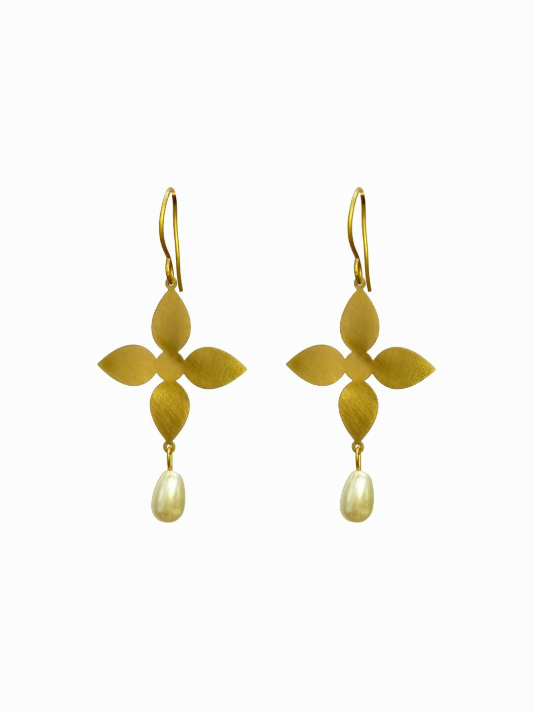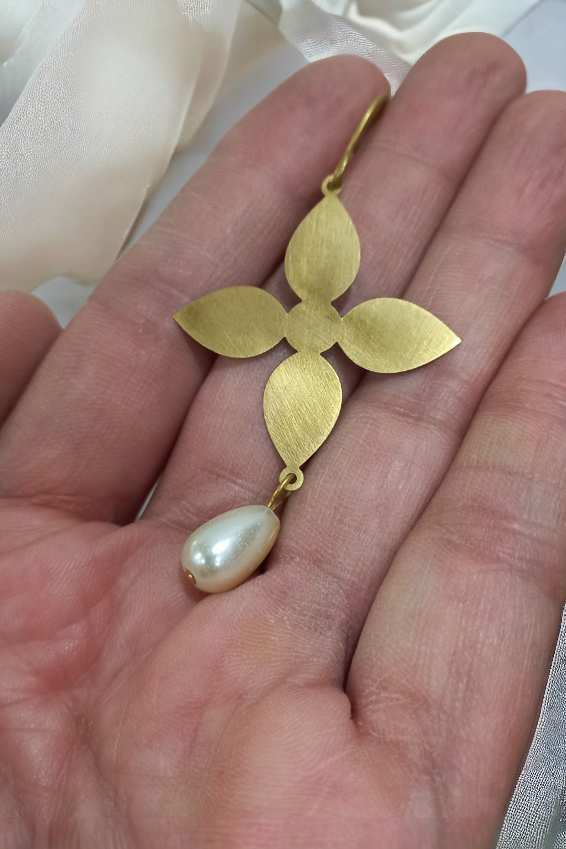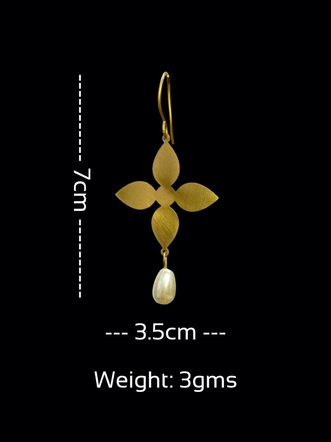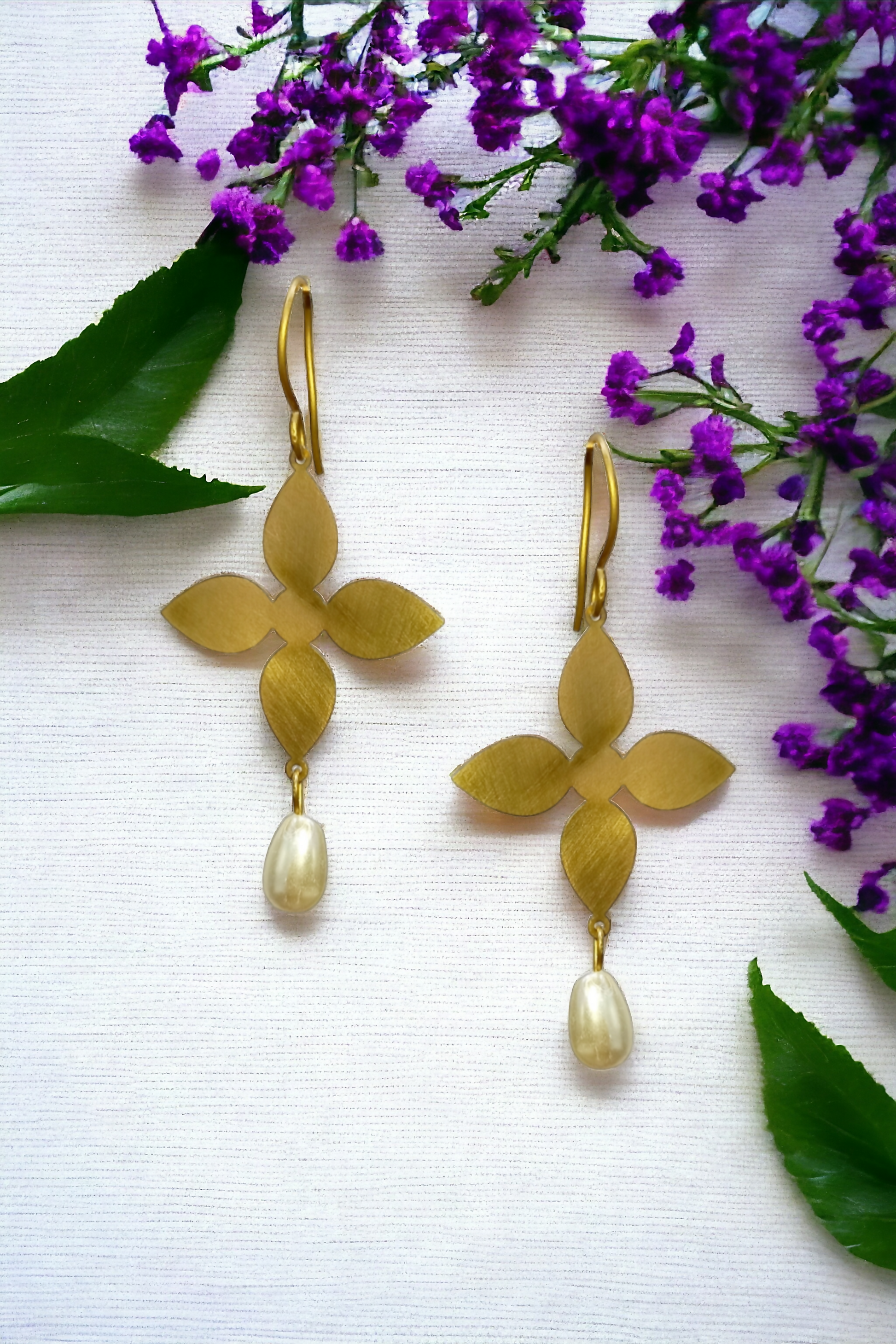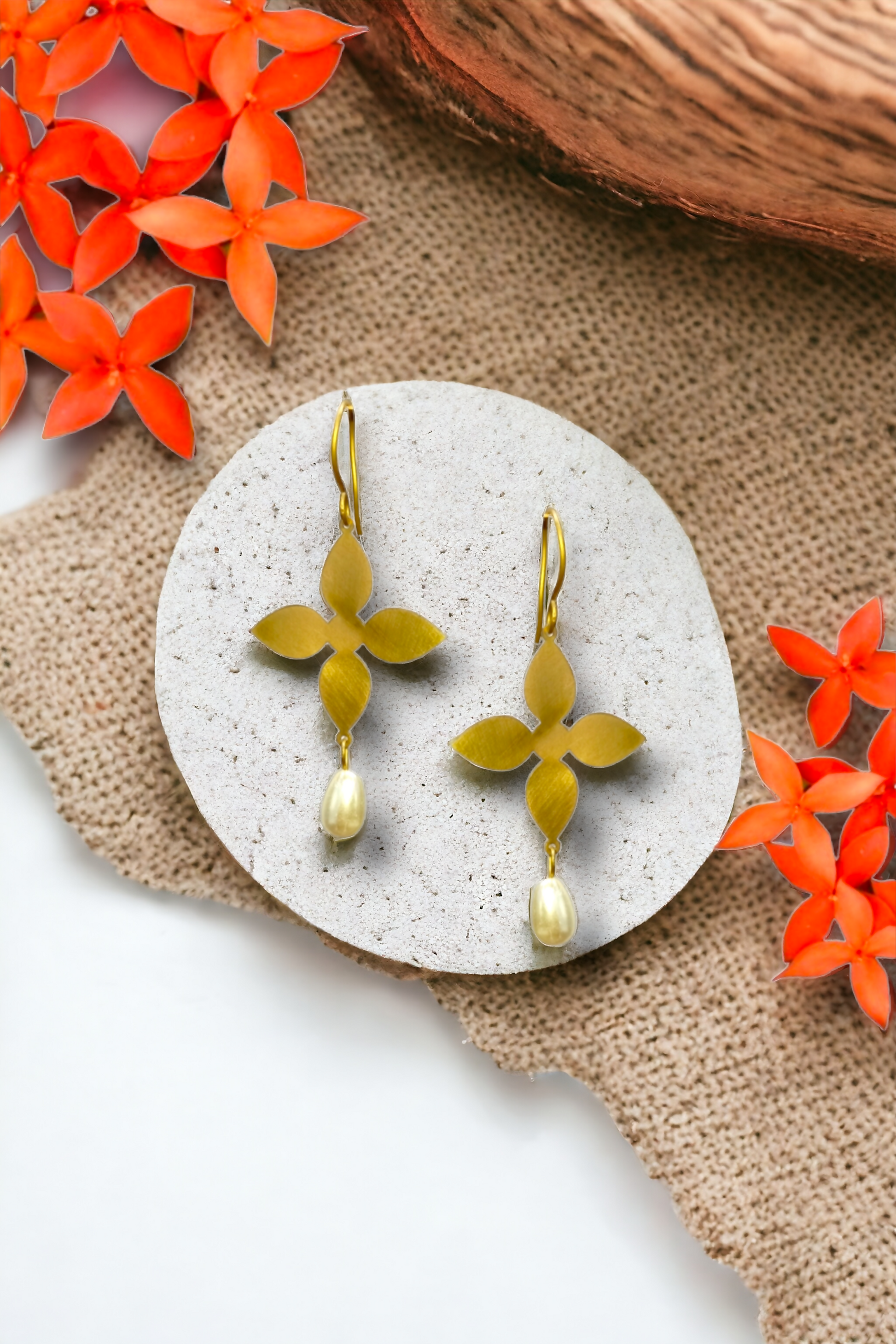 Ixora Flower with Pearl Earrings: Exquisite earrings meticulously crafted from polished brass, each one a graceful tribute to the vibrant ixora flower adorned with a lustrous white pearl. The earrings capture the essence of these tropical blooms with intricate detail, their intricate forms evoking the lush beauty of a tropical garden in full bloom. The brass material infuses the earrings with a warm, golden glow, accentuating the delicate curves and contours of the ixora petals. Wearing these ixora-shaped brass earrings adorned with white pearls is like adorning yourself with a symbol of exotic beauty and natural grace. They're perfect for adding a touch of tropical charm to any outfit, whether for a beachside getaway or an evening soirée in the city.