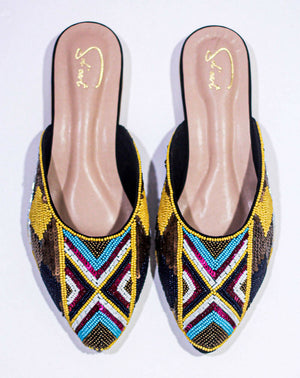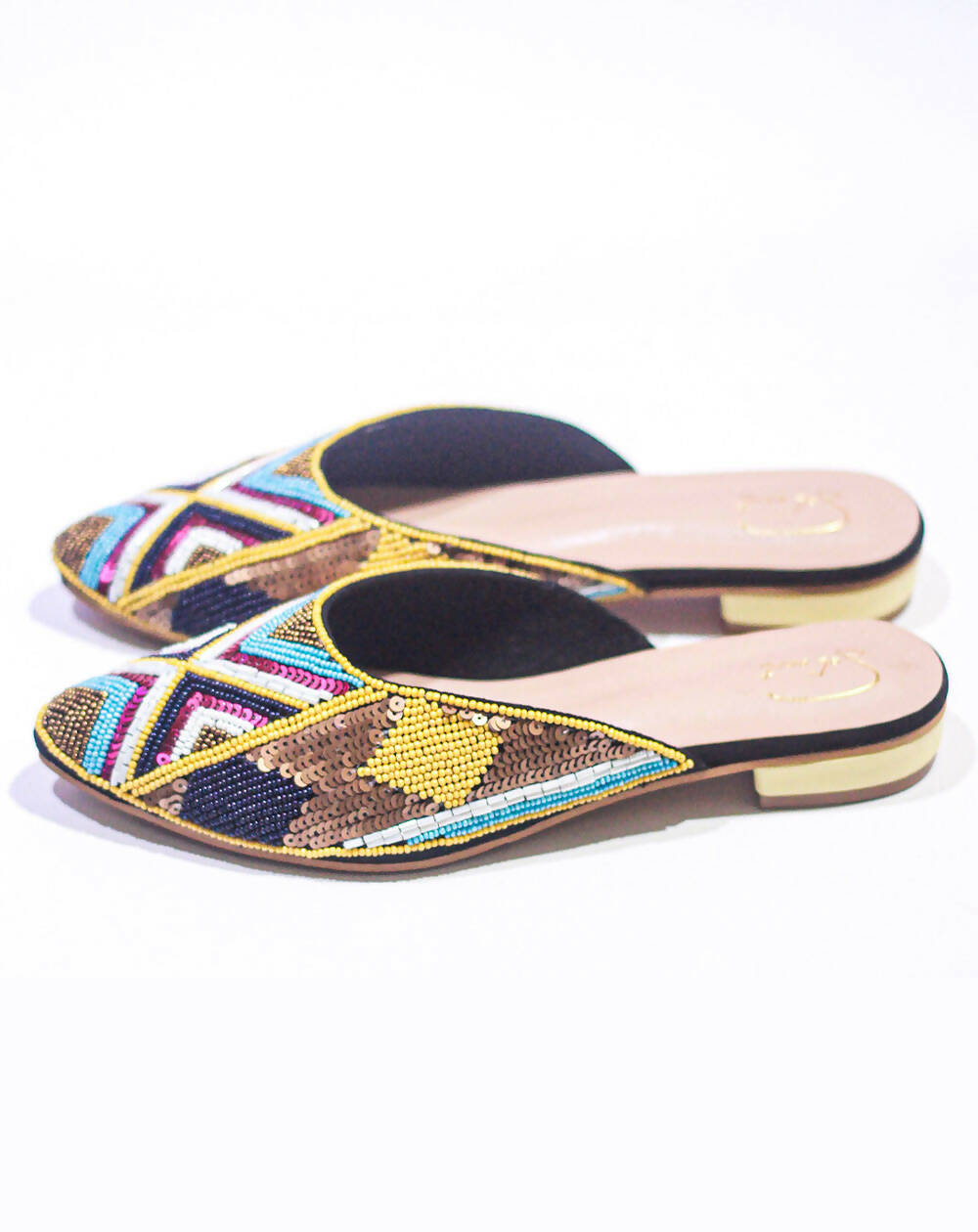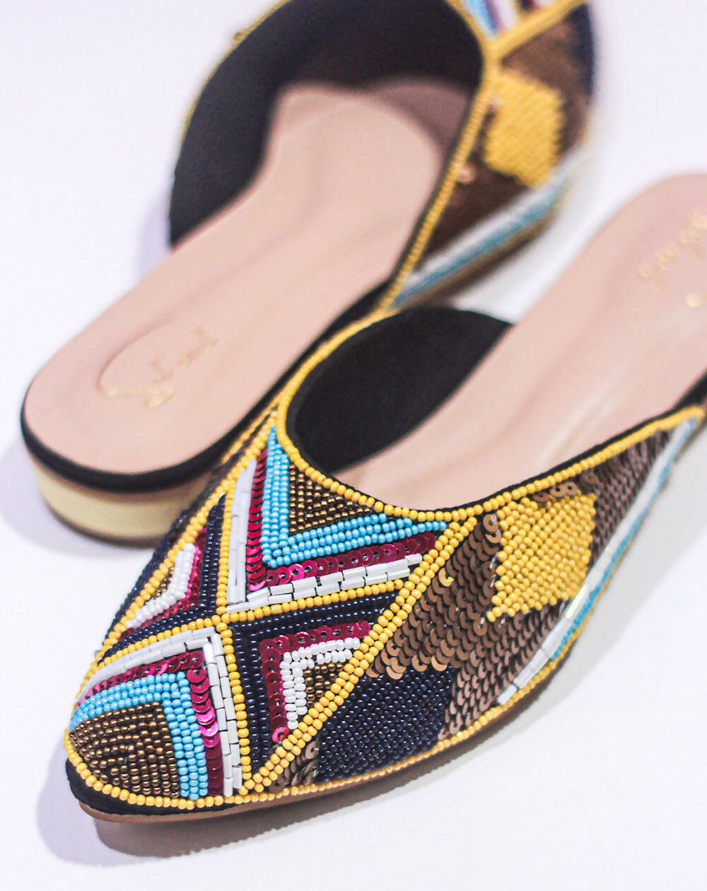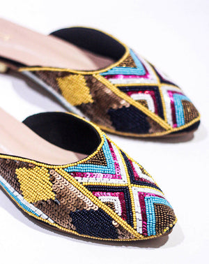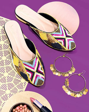 These gorgeous mules feature an intricate pattern of beads, stones and sequins, inspired by art. They are easy to slip on and can be paired with Indian or western looks. Pair them with our matching sling for the ultimate show stopping look!