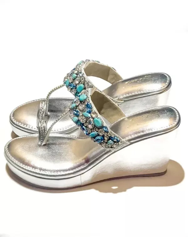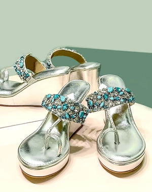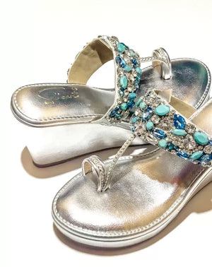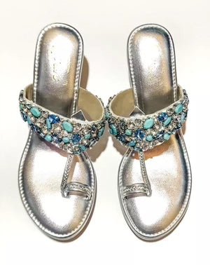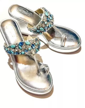 The Mirage kohla are a breathtaking fusion of elegance and modern flair. Crafted to captivate attention, these heels seamlessly blend sophistication with a touch of whimsy. At the forefront of these stunning heels lies a delicate toe ring adorned with intricate silver detailing and an array of shimmering stones. The combination of silver, white, and blue stones creates a mesmerising contrast, reminiscent of glistening ocean waves under the moonlight. Each stone is carefully selected and meticulously placed, enhancing the allure of the design and adding a touch of opulence to the overall aesthetic. Flaunt your unique sense of style and leave a lasting impression with these exquisite heels that effortlessly combine sophistication and allure.