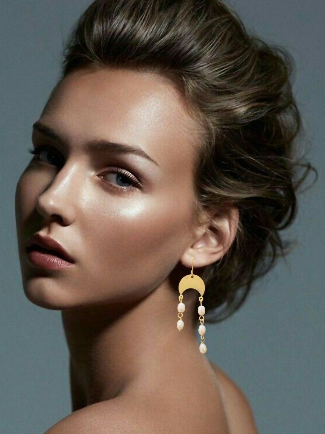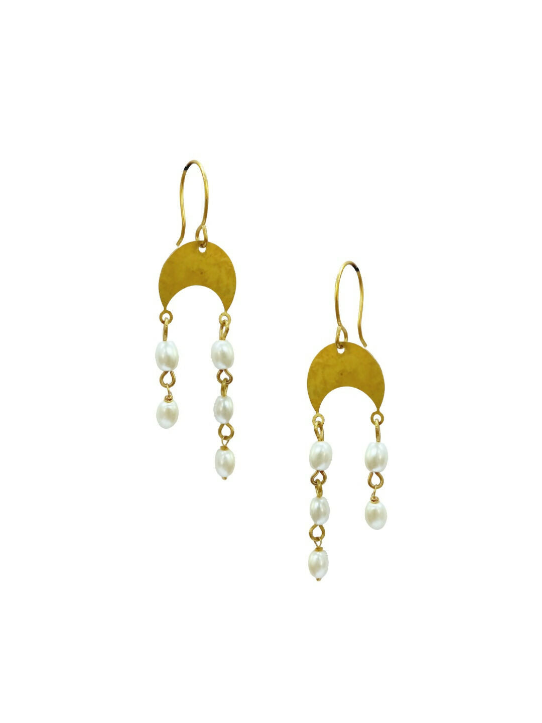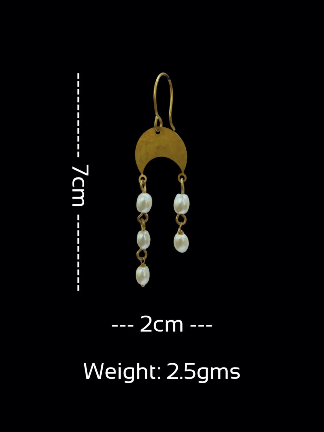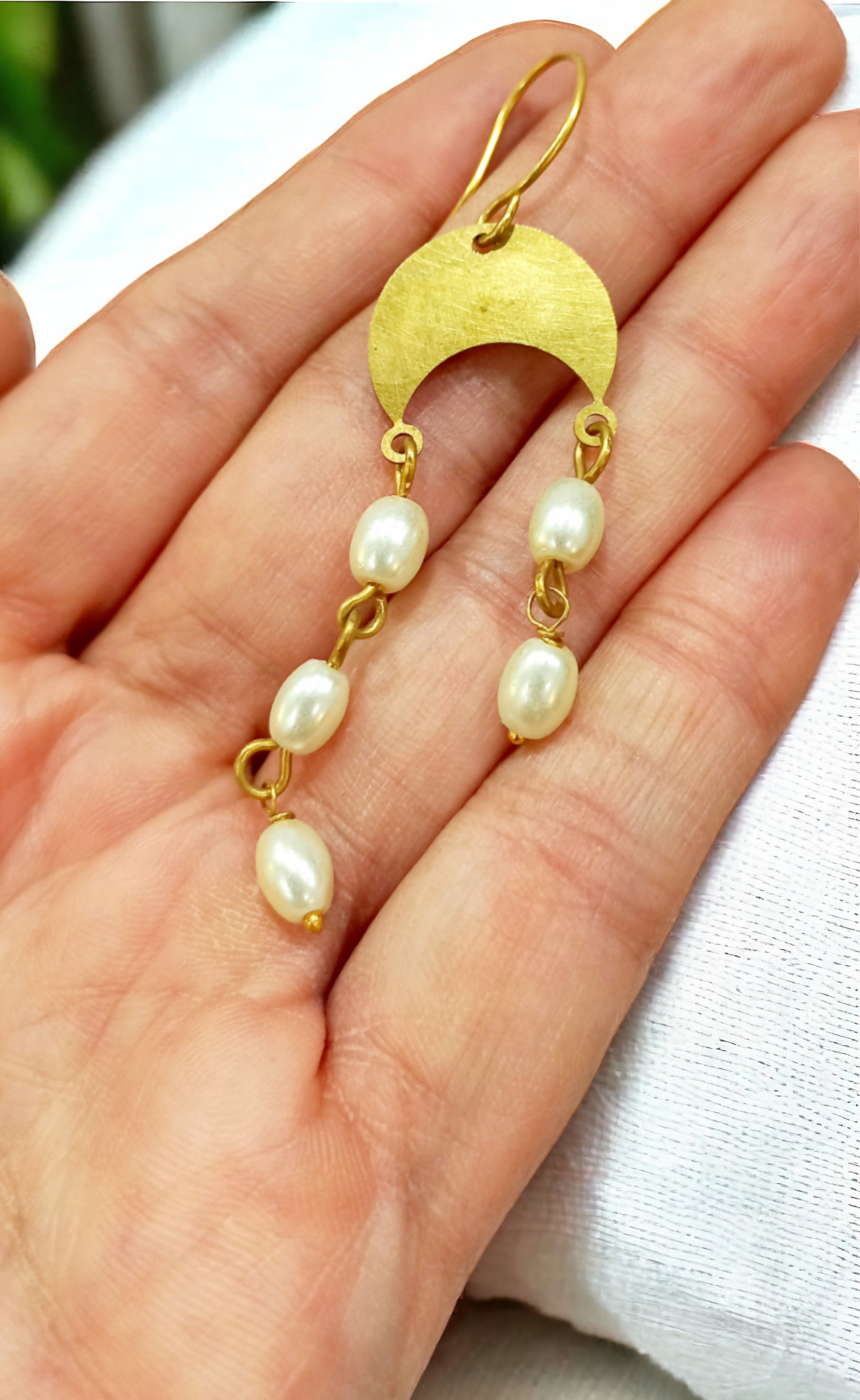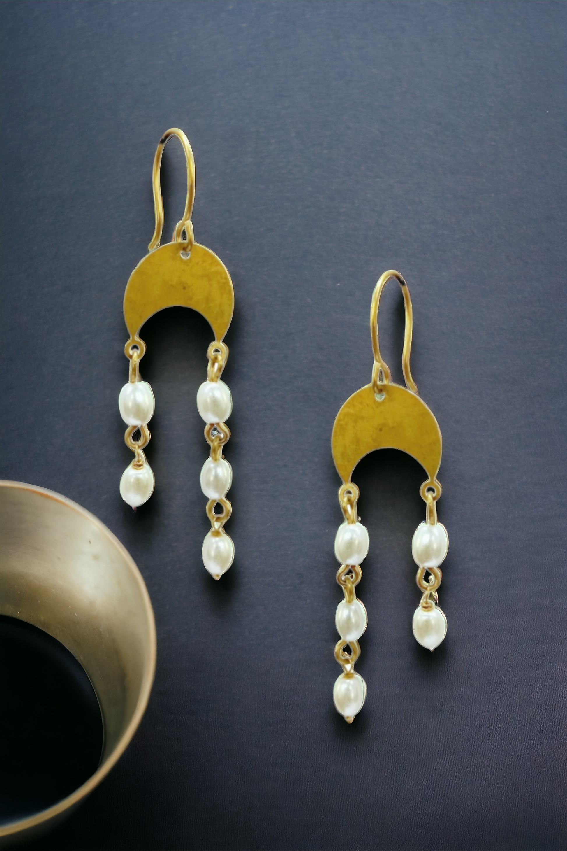 Half Moon with Pearls Earrings: The graceful curve of the half-moon design evokes a sense of celestial beauty, while the warm brass hue infuses a touch of antiquity, adding depth and character to these exquisite earrings. Each earring is adorned with a shimmering pearl, suspended within the crescent embrace of the brass frame. The pearls, with their iridescent sheen and timeless allure, lend a touch of refinement and opulence to the design, creating a mesmerizing contrast against the rustic backdrop of brass. Whether you're stargazing under the night sky or attending a sophisticated soirée, they are sure to be a captivating conversation piece, radiating elegance and grace wherever you go.