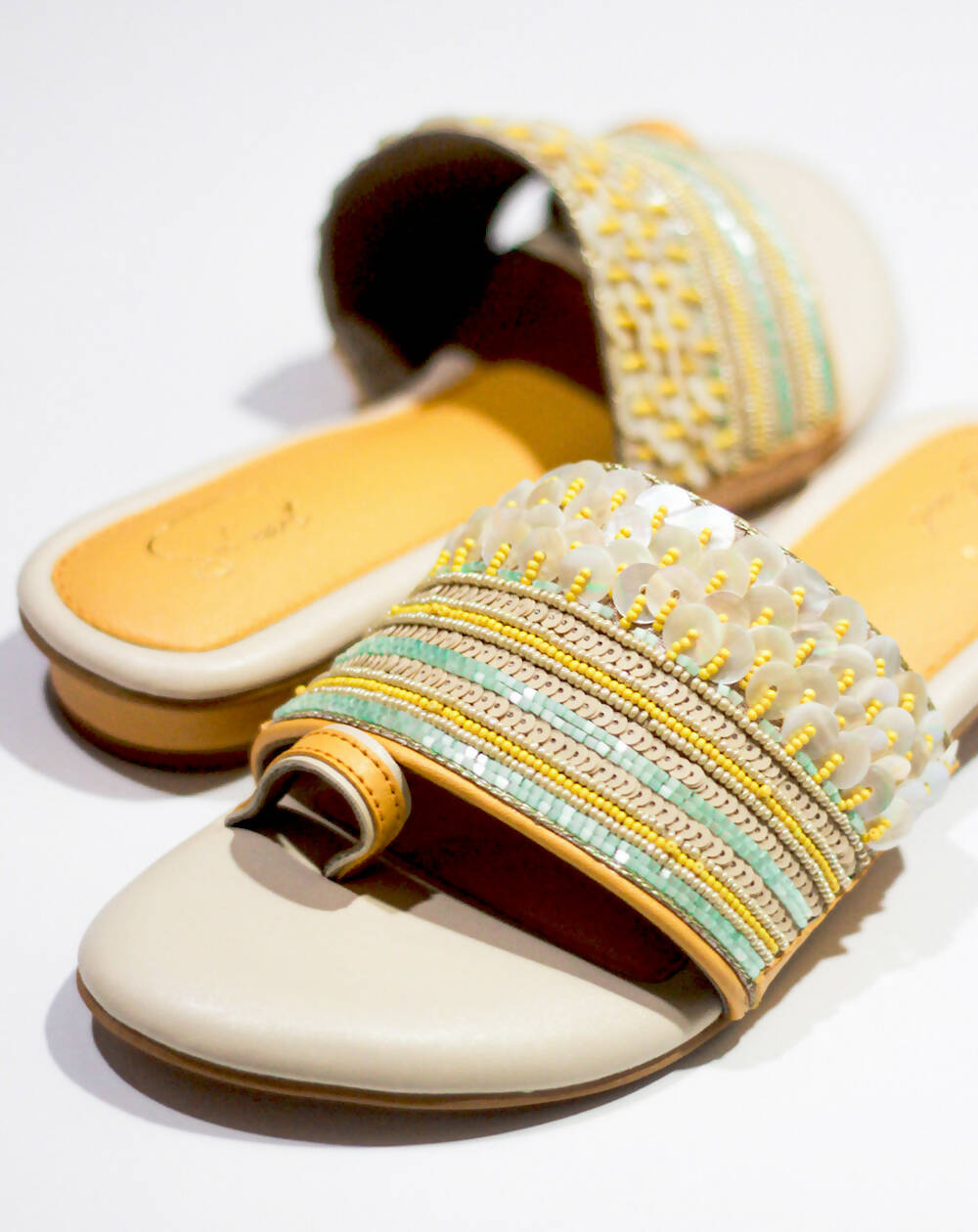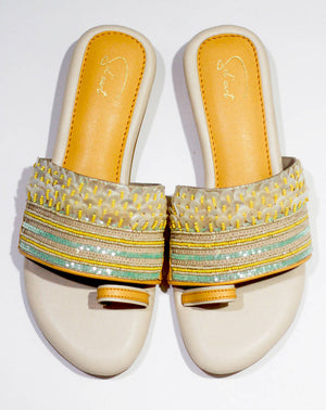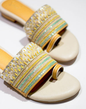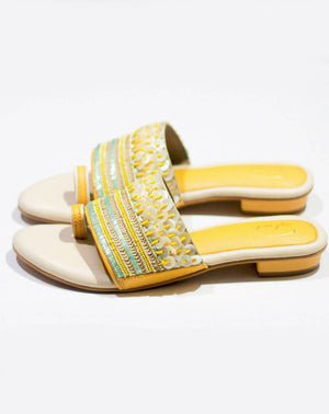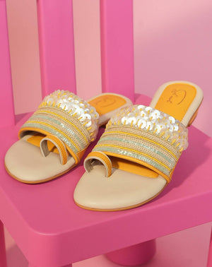 This stunning footwear is a true embodiment of the vibrant spirit of the beach, boasting a captivating design that harmoniously blends sequins, beads, and a sunny yellow colour palette. Every step you take in the "Sunset Shimmer" shoe will feel like a leisurely walk along the sandy shoreline, with the sequins and beads glistening like the setting sun on a perfect day at the beach. Get ready to turn heads and capture the essence of summer with these enchanting and beachy shoes!