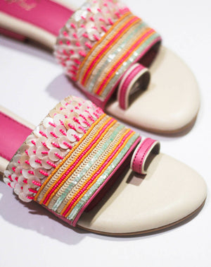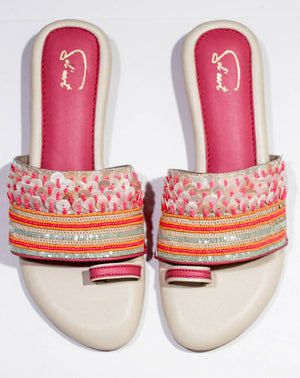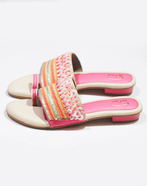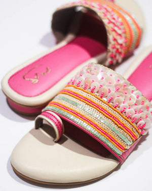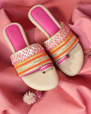 Step into the world of coastal enchantment with the “Oceanic Faery” shoes! This captivating footwear captures the essence of the beach with its delightful pink hue, sparkling sequins, and exquisite beadwork. Delicate beads in various shades of pink, orange and iridescent white are meticulously hand-sewn onto the upper in patterns inspired by seashells and coral reefs. These delicate accents add a touch of elegance and allure, making the “Oceanic Faery” shoes a true statement piece.