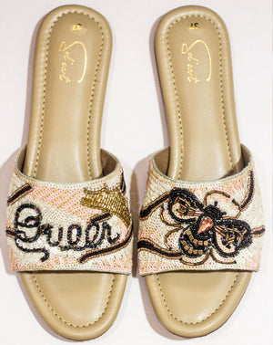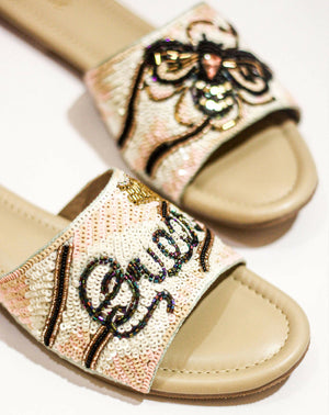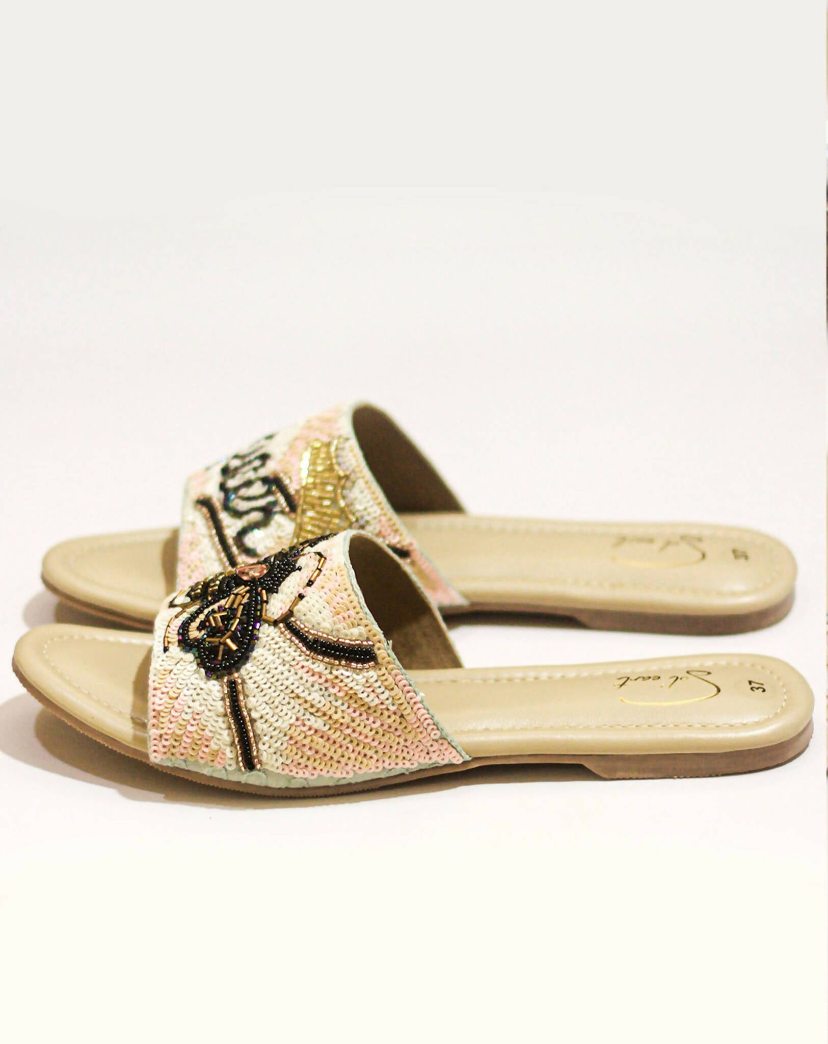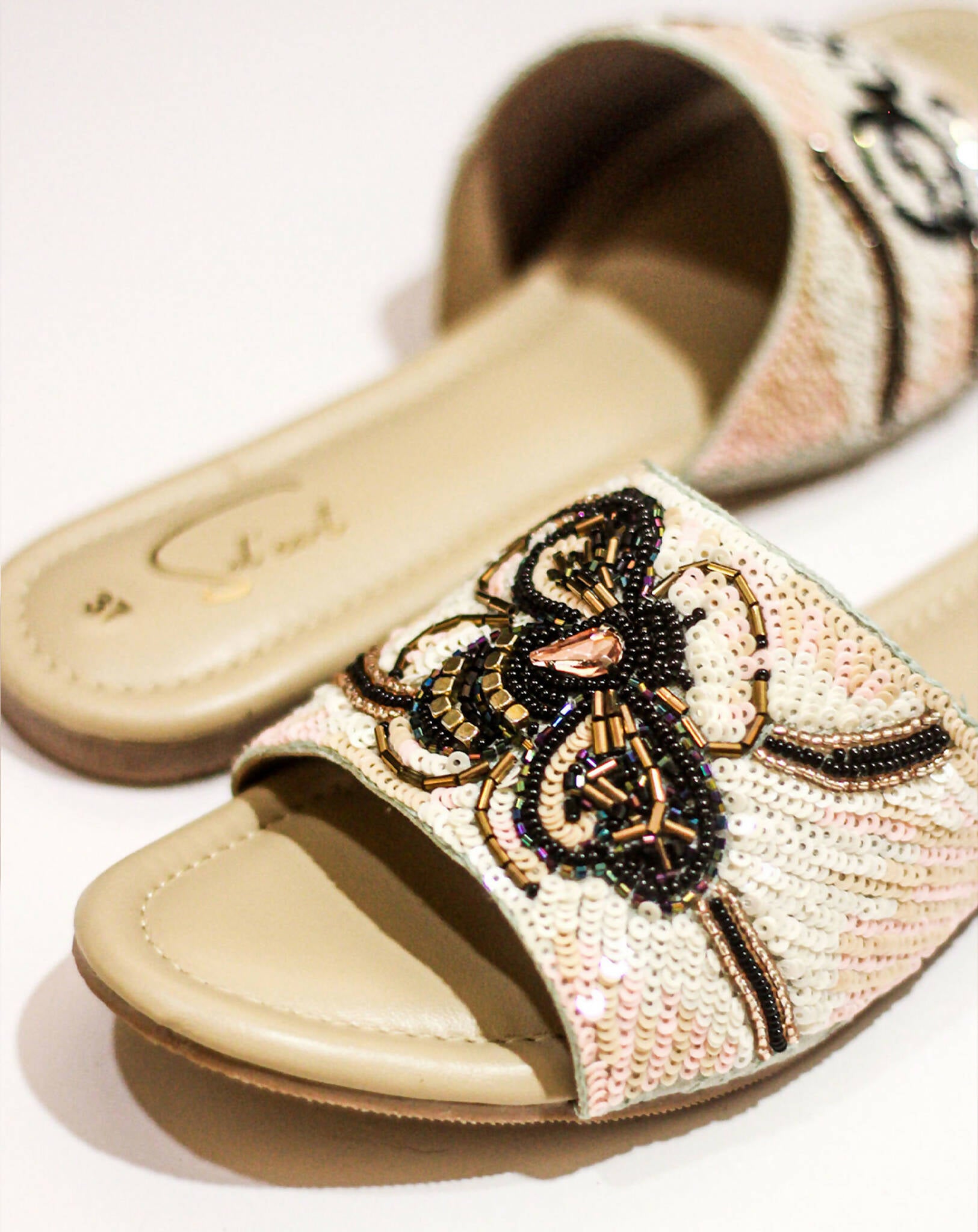 A queen bee is the leader of the beehive, who unifies the entire colony. We created the Queen Bee sliders for all the assertive women out there who are go-getters and doers. These sliders are handcrafted with an array of sequins, beads and glass tubes and come in a muted colour, so they are easy to pair with denims or with casual Indian wear.