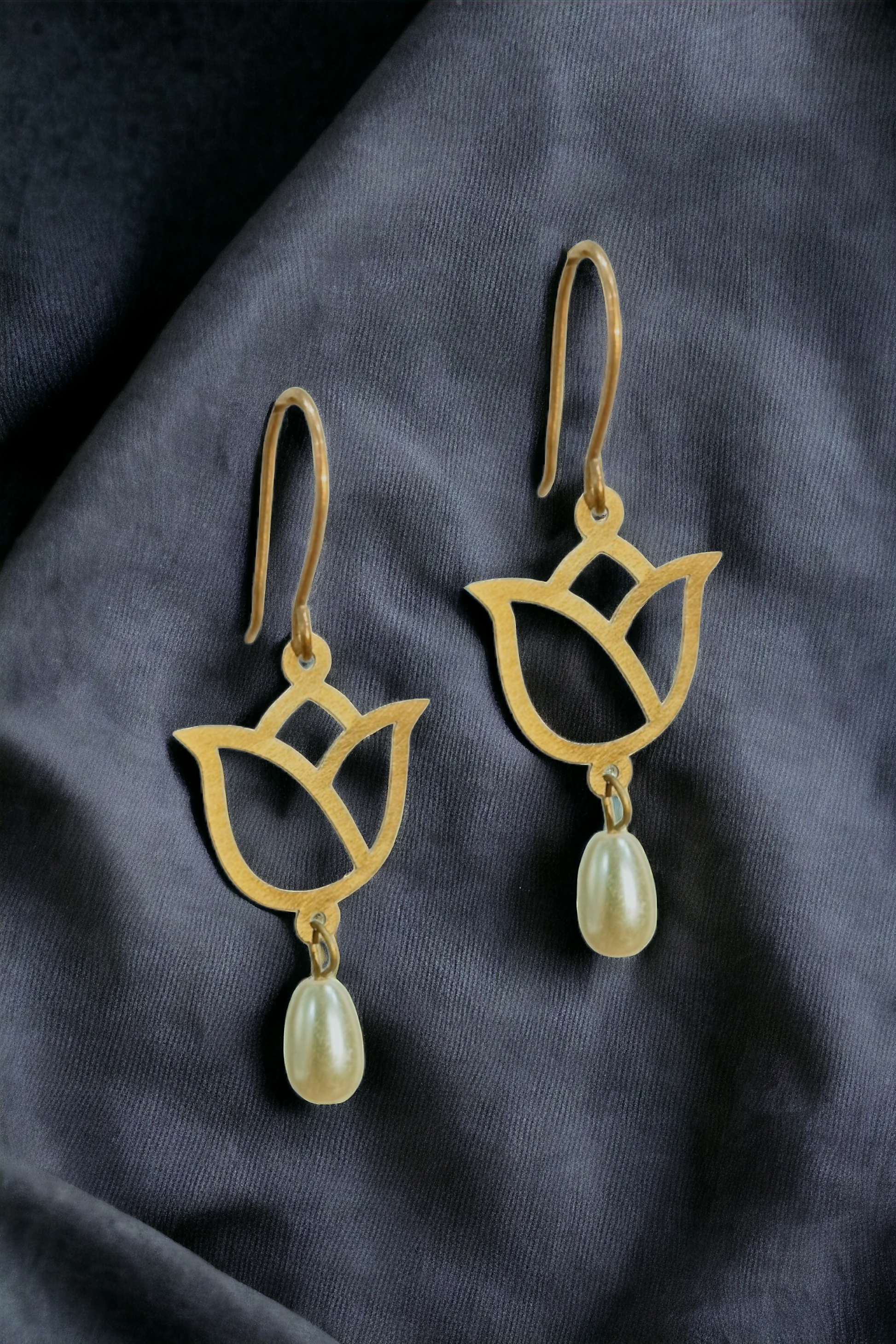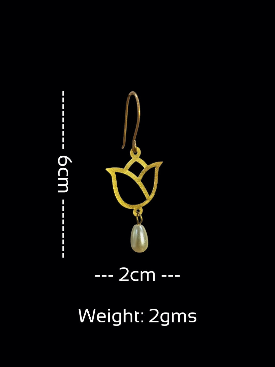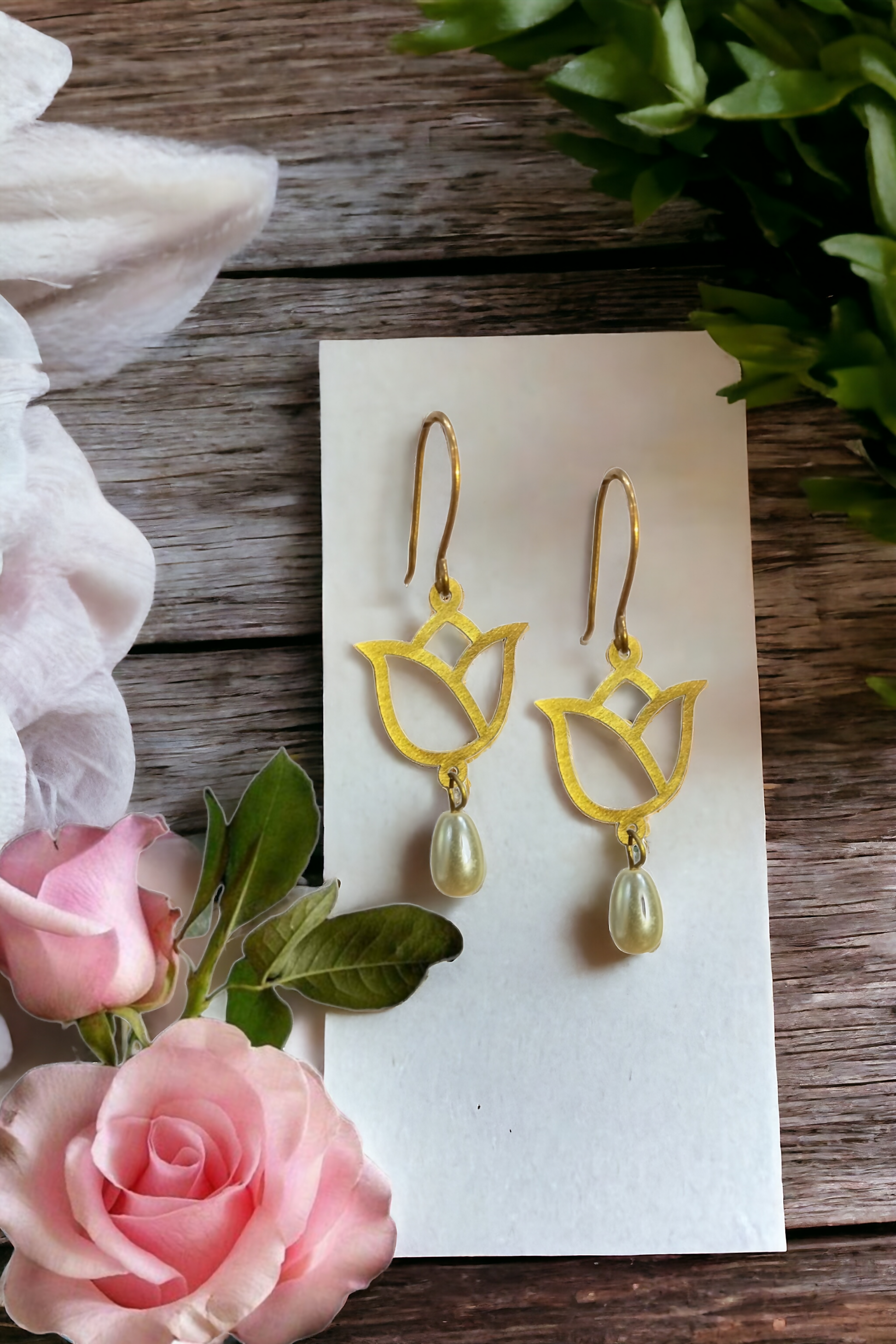 Rose Bud Earrings with Pearl: Embrace the timeless beauty of the rose with these exquisite rose bud-shaped brass earrings, each adorned with a radiant pearl. Inspired by the delicate allure of blooming roses, these earrings capture the essence of romance and elegance. At the bottom of the rose bud is a luminous pearl, its iridescent sheen reminiscent of dewdrops glistening in the morning sun. The pearl adds a hint of opulence and refinement to the design, enhancing the romantic beauty of the rose bud shape. Lightweight and comfortable to wear, these earrings exude understated glamour and sophistication. Whether you're attending a special occasion or adding a touch of elegance to your everyday look, they effortlessly elevate any ensemble with their timeless charm.