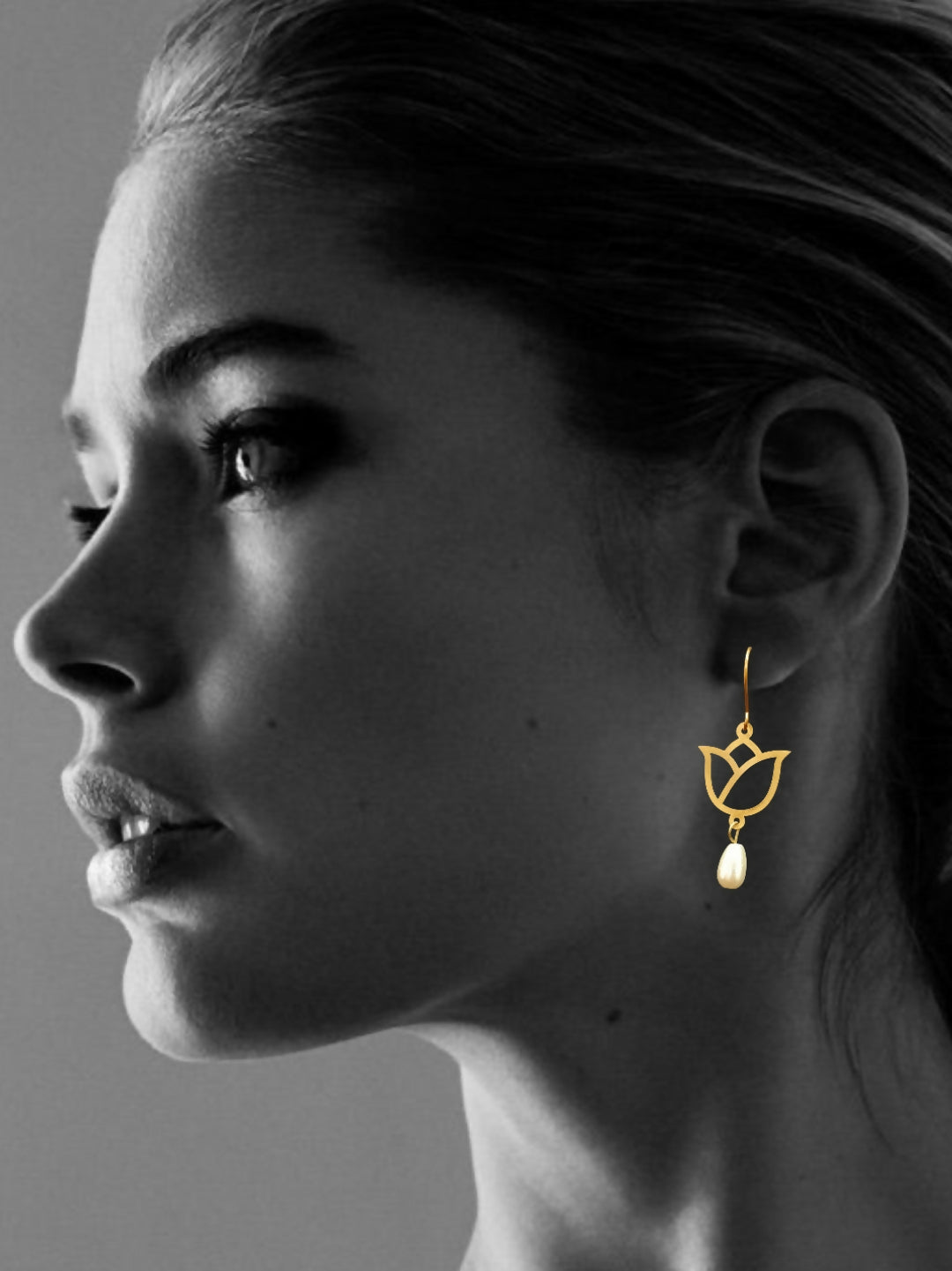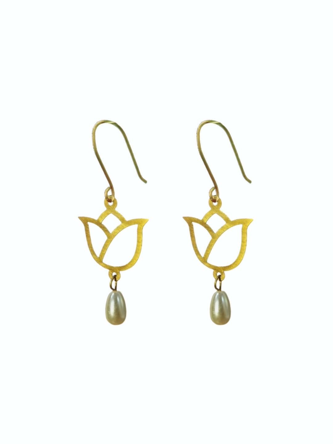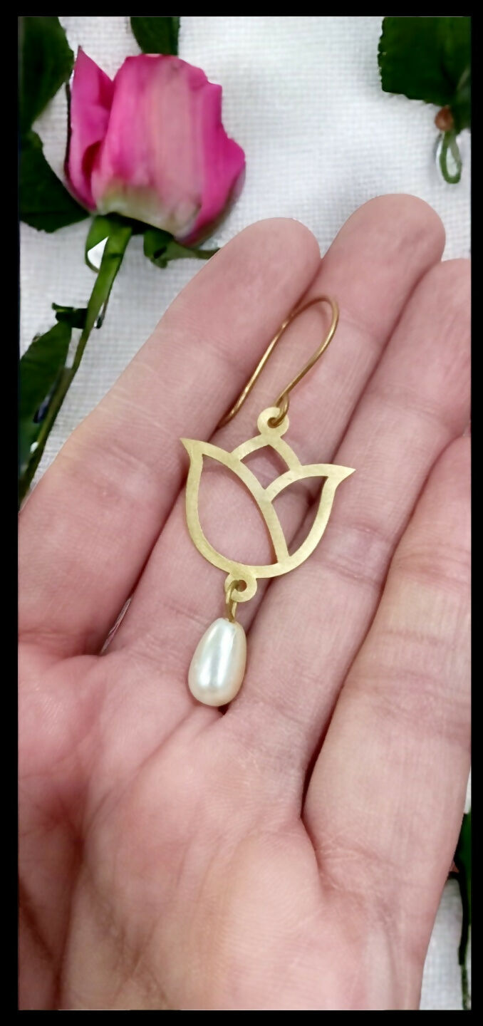 Rose Bud Earrings with Pearl: Embrace the timeless beauty of the rose with these exquisite rose bud-shaped brass earrings, each adorned with a radiant pearl. Inspired by the delicate allure of blooming roses, these earrings capture the essence of romance and elegance. At the bottom of the rose bud is a luminous pearl, its iridescent sheen reminiscent of dewdrops glistening in the morning sun. The pearl adds a hint of opulence and refinement to the design, enhancing the romantic beauty of the rose bud shape. Lightweight and comfortable to wear, these earrings exude understated glamour and sophistication. Whether you're attending a special occasion or adding a touch of elegance to your everyday look, they effortlessly elevate any ensemble with their timeless charm.