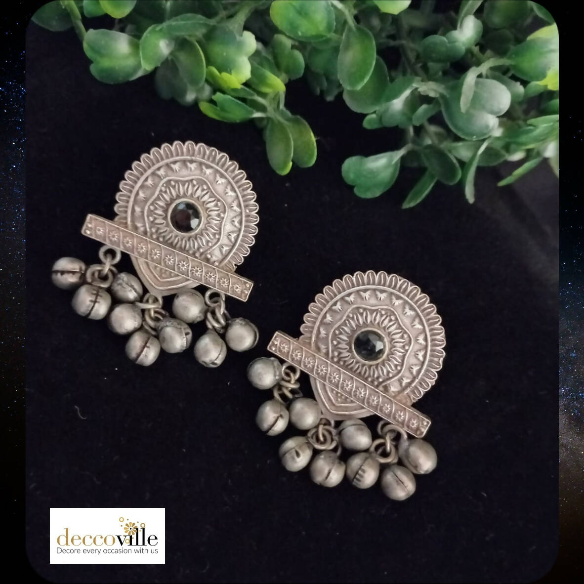 Jazz up your ethnic look with these earrings. These round Ghungroo stud earrings are handcrafted with oxidized silver and feature an iconic bunch of Ghungroo's that add a lively character to your look. With Ghungroo's always being a trendsetter.