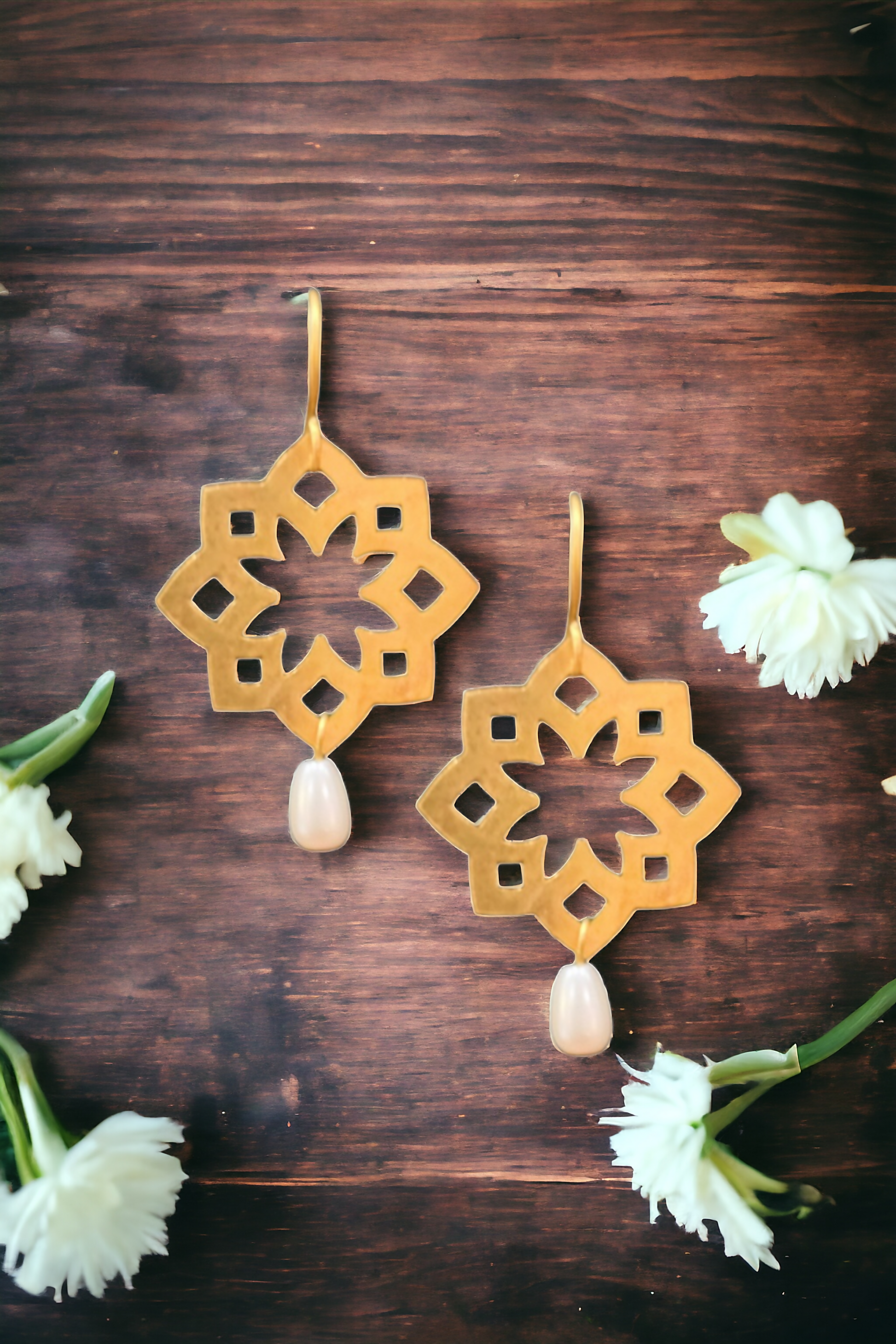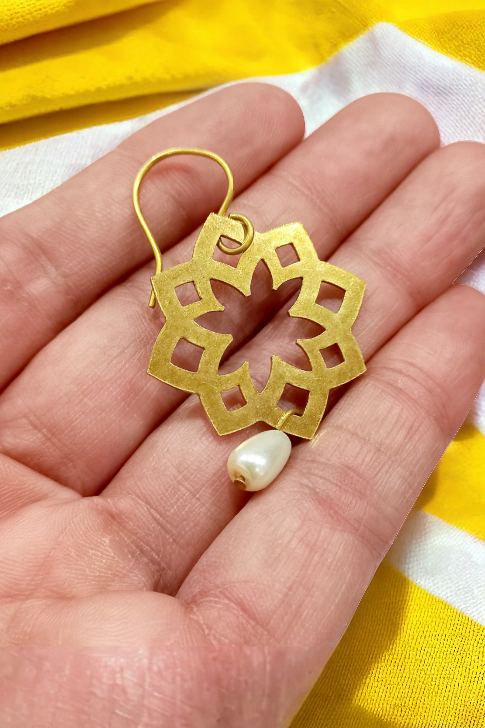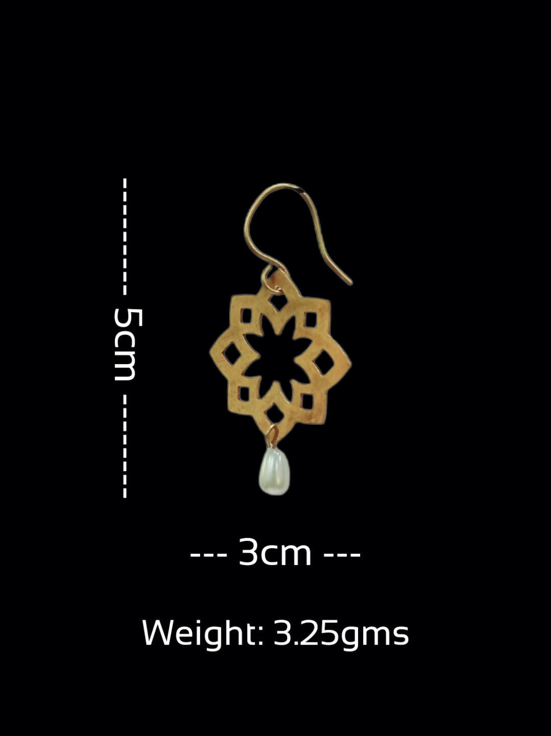 Round Nakshi with Pearl: Transport yourself to the regal courts of ancient India with these exquisite raw brass earrings, adorned with a traditional round design and lustrous hanging pearl. Each earring showcases a circular brass frame, meticulously crafted to evoke the timeless elegance of Indian jewelry. As you wear these earrings, you become a vision of timeless elegance, channeling the grace and poise of India's rich cultural heritage. Let the gentle sway of the pearl and the intricate detailing of the brass transport you to a bygone era of opulence and refinement, where every adornment told a story of beauty and tradition.