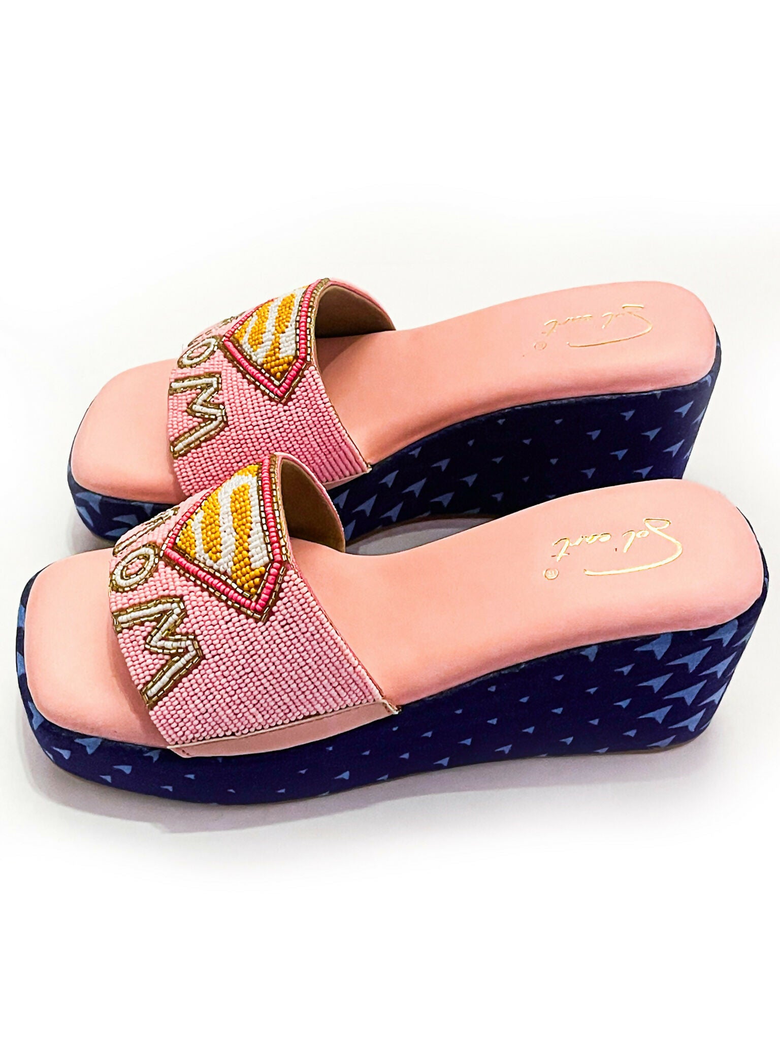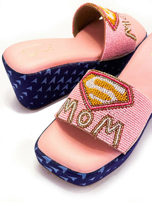 The S-Mom pink flatform is a vibrant and playful footwear option designed to capture attention with its bold style and unique details. At its forefront, the shoe features a Superman-style embroidered emblem, meticulously crafted with colourful beads, infusing it with a sense of superhero charm and whimsy. Adding to its distinctive design, the shoe boasts a printed denim lining, providing both visual interest and a touch of casual flair. The denim lining not only adds texture and depth to the shoe’s appearance but also offers a comfortable and breathable interior for all-day wear. The wedge heel design not only enhances the shoe’s fashion-forward aesthetic but also ensures comfortable and confident strides.