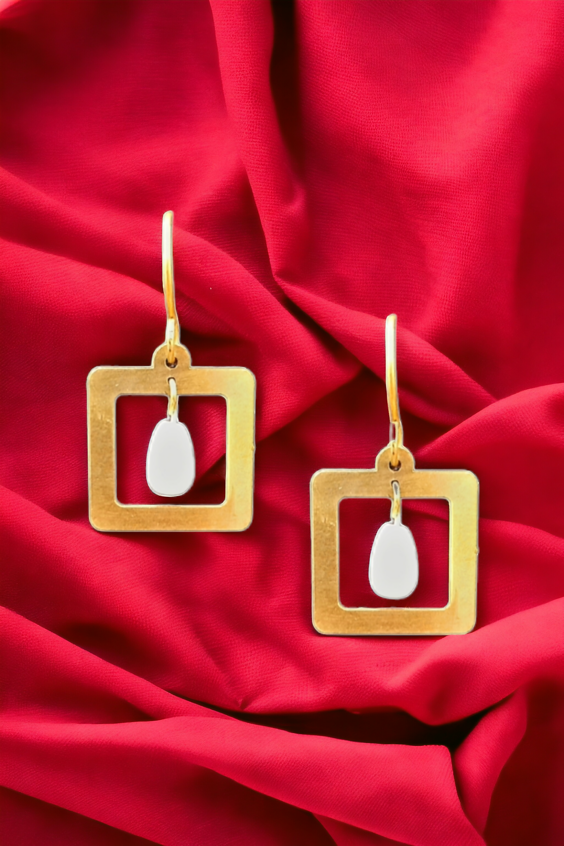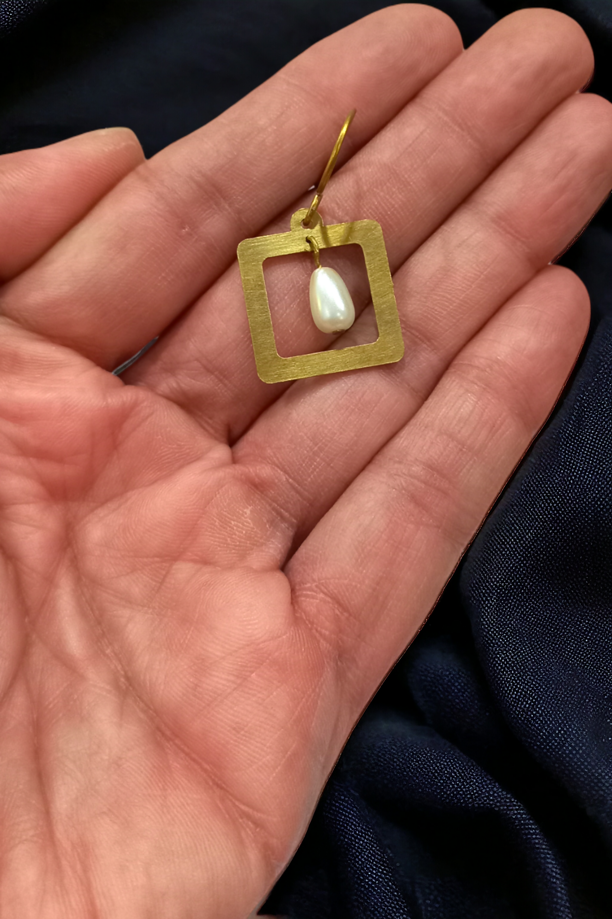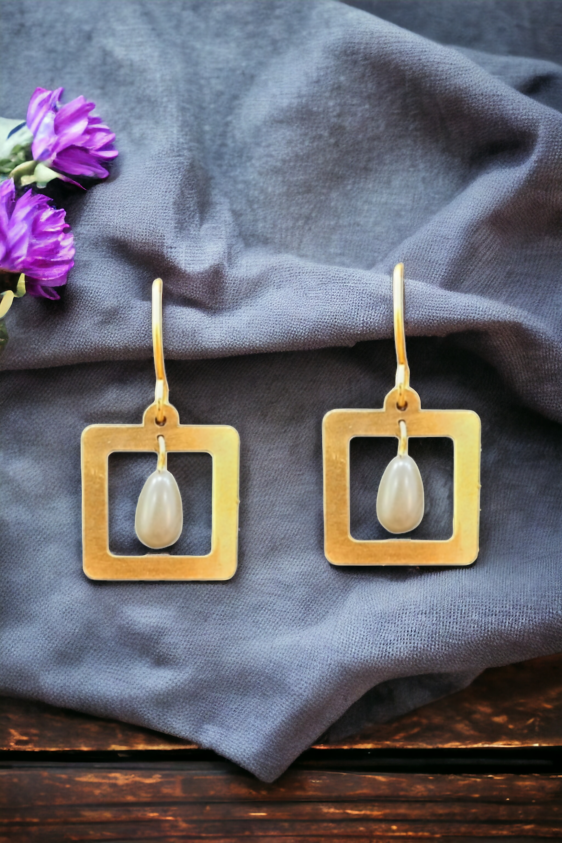 Square with Pearl Earrings: The square shape symbolizes stability, balance, and order, making these earrings a perfect choice for those who seek refinement and simplicity in their accessories. Whether worn with casual attire or paired with formal wear, they effortlessly elevate any ensemble with their understated allure. Nestled within the center of each square is a radiant pearl, its lustrous surface adding a hint of opulence and sophistication to the design. The pearl's iridescent sheen contrasts beautifully with the warm tones of the brass, creating a captivating focal point that enhances the elegance of the earrings. Embrace the beauty of simplicity with these square-shaped brass earrings adorned with pearls, a versatile accessory that pairs effortlessly with any outfit and exudes timeless elegance in every detail. Whether you're a minimalist at heart or simply appreciate classic design with a touch of refinement, these earrings are sure to become a staple in your jewelry collection.