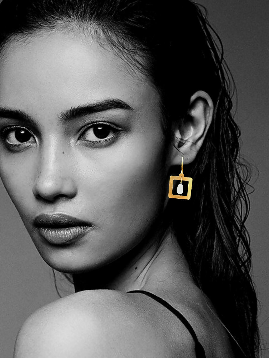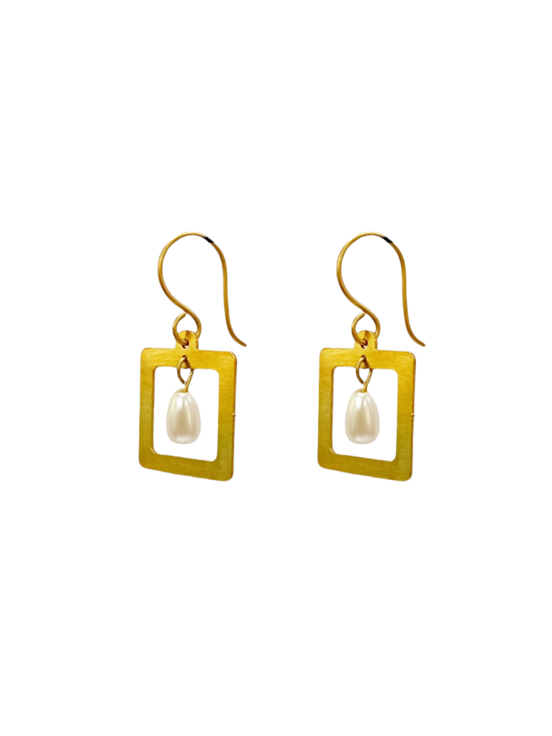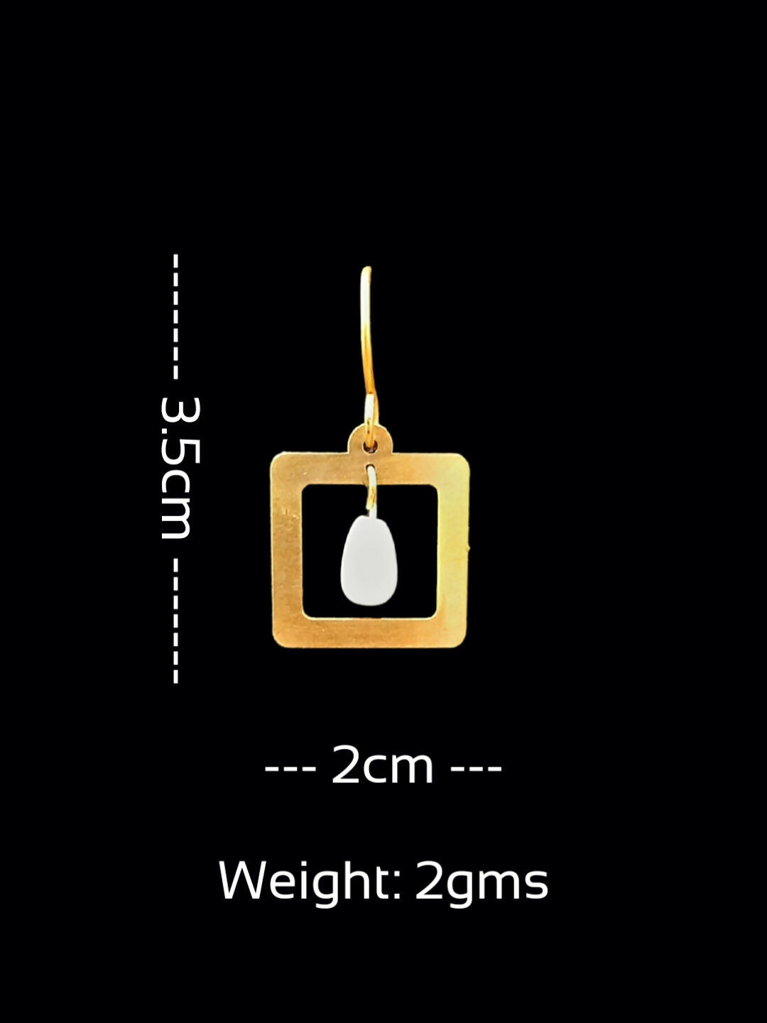 Square with Pearl Earrings: The square shape symbolizes stability, balance, and order, making these earrings a perfect choice for those who seek refinement and simplicity in their accessories. Whether worn with casual attire or paired with formal wear, they effortlessly elevate any ensemble with their understated allure. Nestled within the center of each square is a radiant pearl, its lustrous surface adding a hint of opulence and sophistication to the design. The pearl's iridescent sheen contrasts beautifully with the warm tones of the brass, creating a captivating focal point that enhances the elegance of the earrings. Embrace the beauty of simplicity with these square-shaped brass earrings adorned with pearls, a versatile accessory that pairs effortlessly with any outfit and exudes timeless elegance in every detail. Whether you're a minimalist at heart or simply appreciate classic design with a touch of refinement, these earrings are sure to become a staple in your jewelry collection.