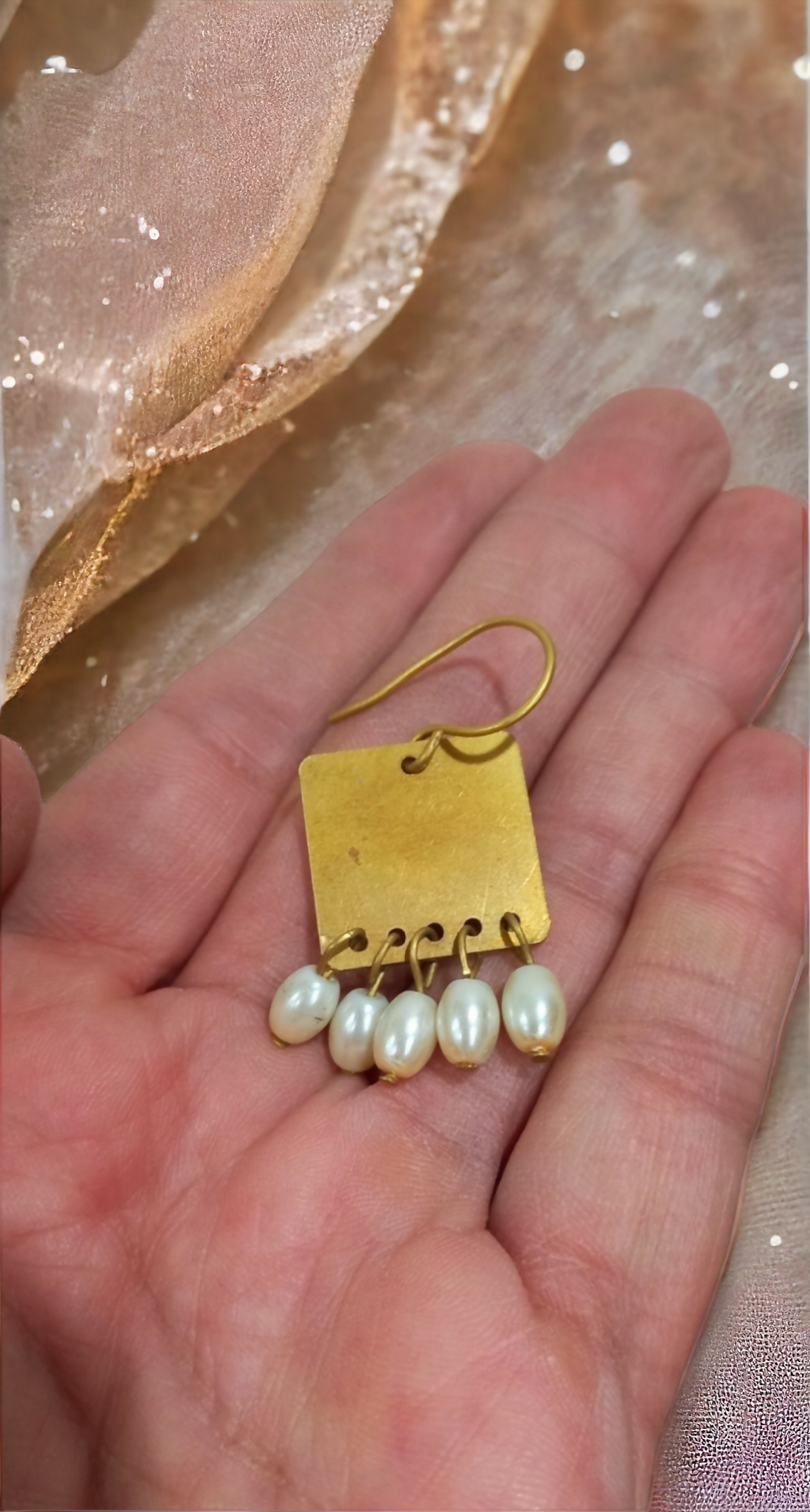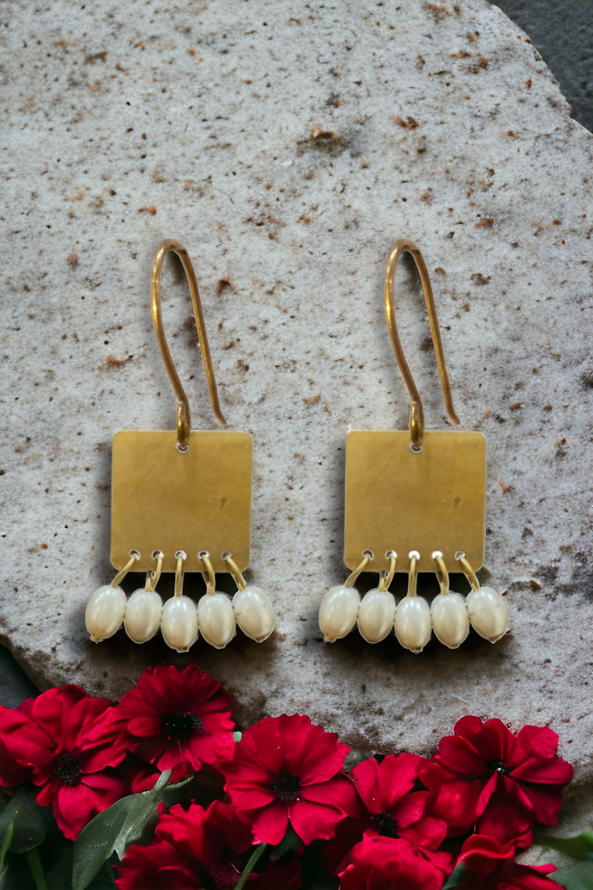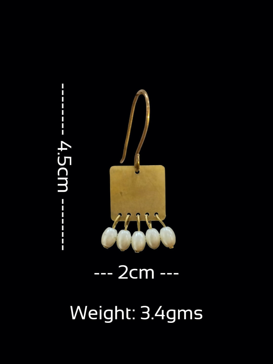 Square with Pearl Earrings: The square shape symbolizes stability, balance, and order, making these earrings a perfect choice for those who seek refinement and simplicity in their accessories. Whether worn with casual attire or paired with formal wear, they effortlessly elevate any ensemble with their understated allure. Hinging out from each piece are a group of radiant pearls, its lustrous surface adding a hint of opulence and sophistication to the design. The pearl's iridescent sheen contrasts beautifully with the warm tones of the brass, creating a captivating focal point that enhances the elegance of the earrings. Embrace the beauty of simplicity with these square-shaped brass earrings adorned with pearls, a versatile accessory that pairs effortlessly with any outfit and exudes timeless elegance in every detail. Whether you're a minimalist at heart or simply appreciate classic design with a touch of refinement, these earrings are sure to become a staple in your jewelry collection.