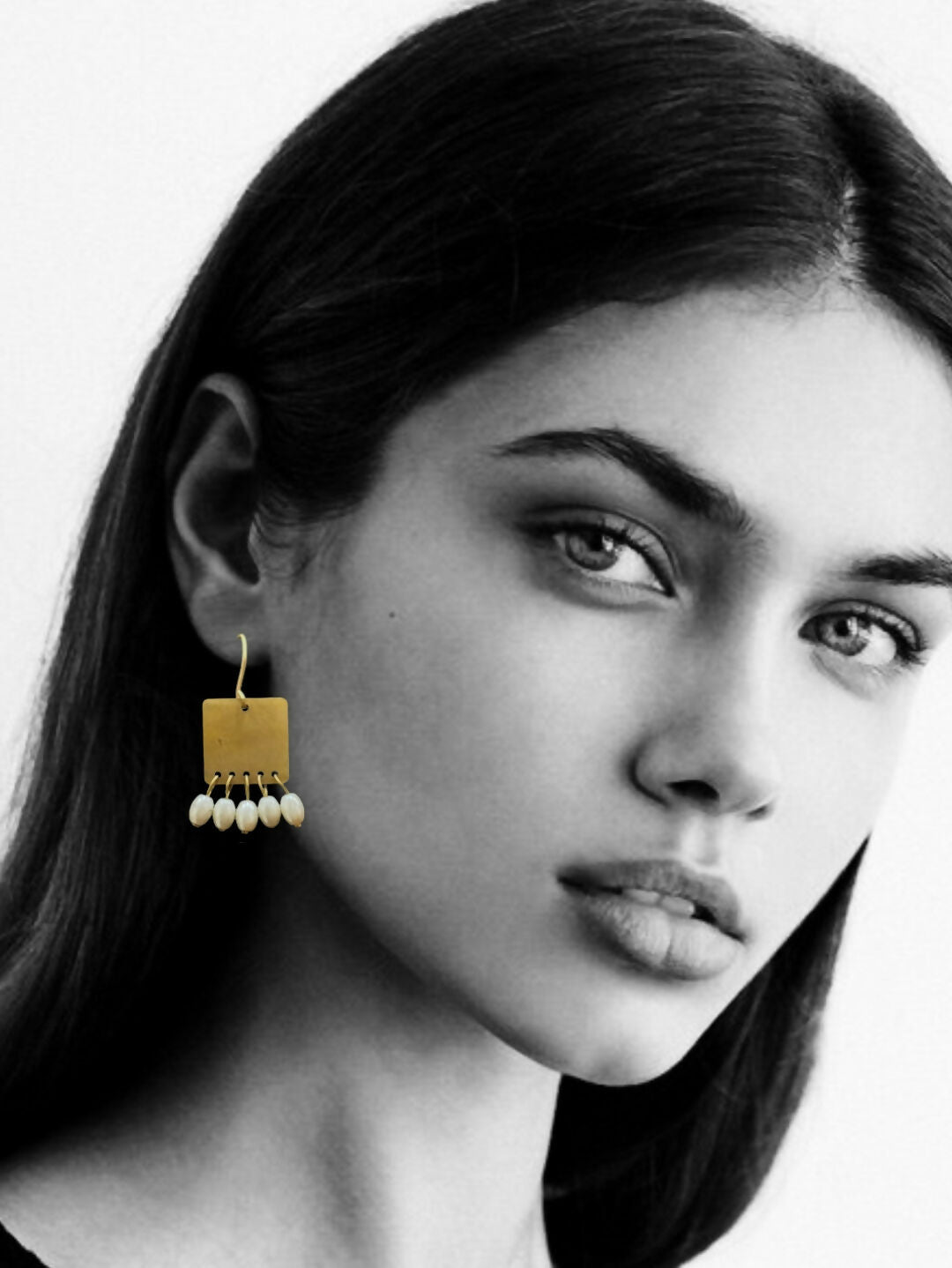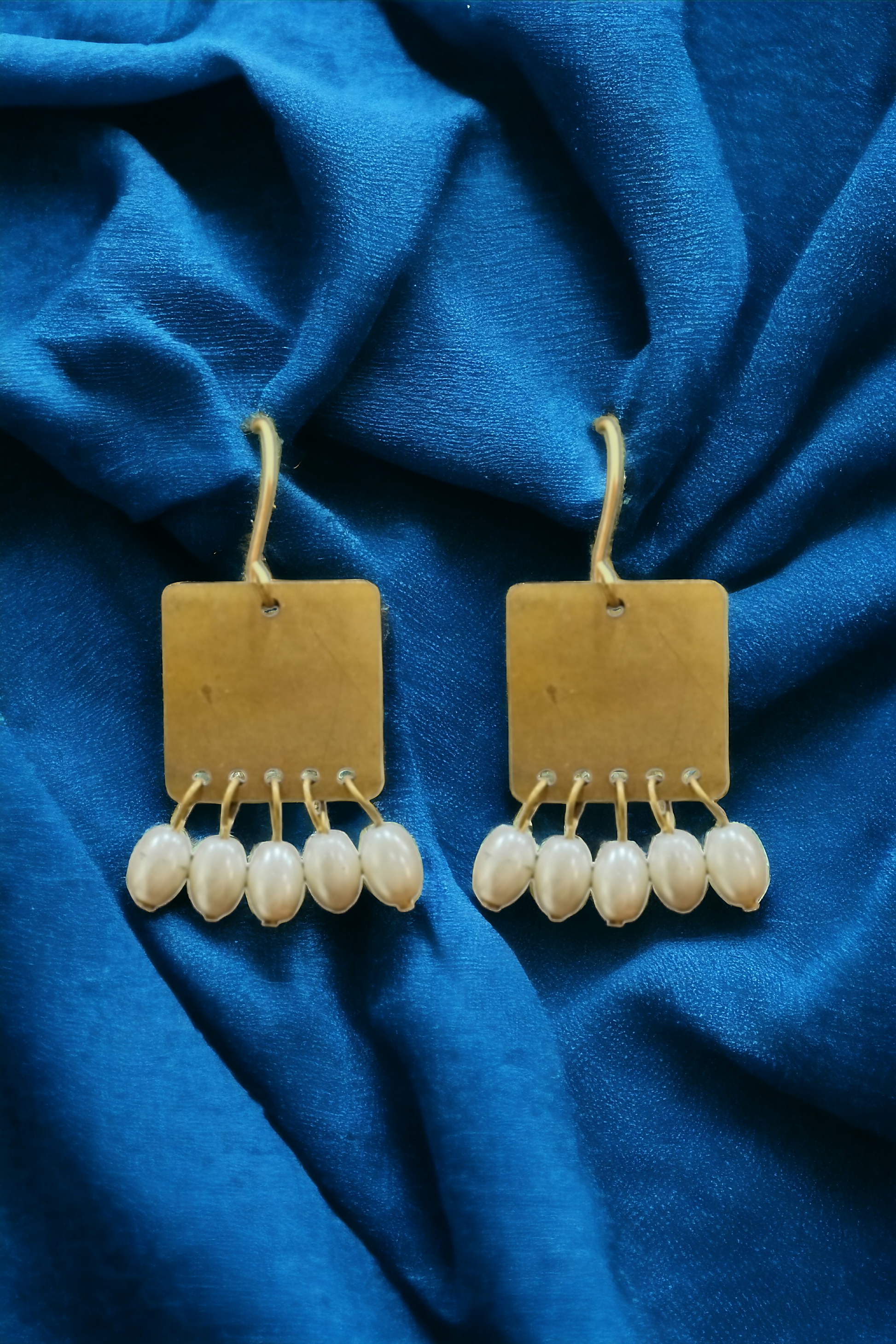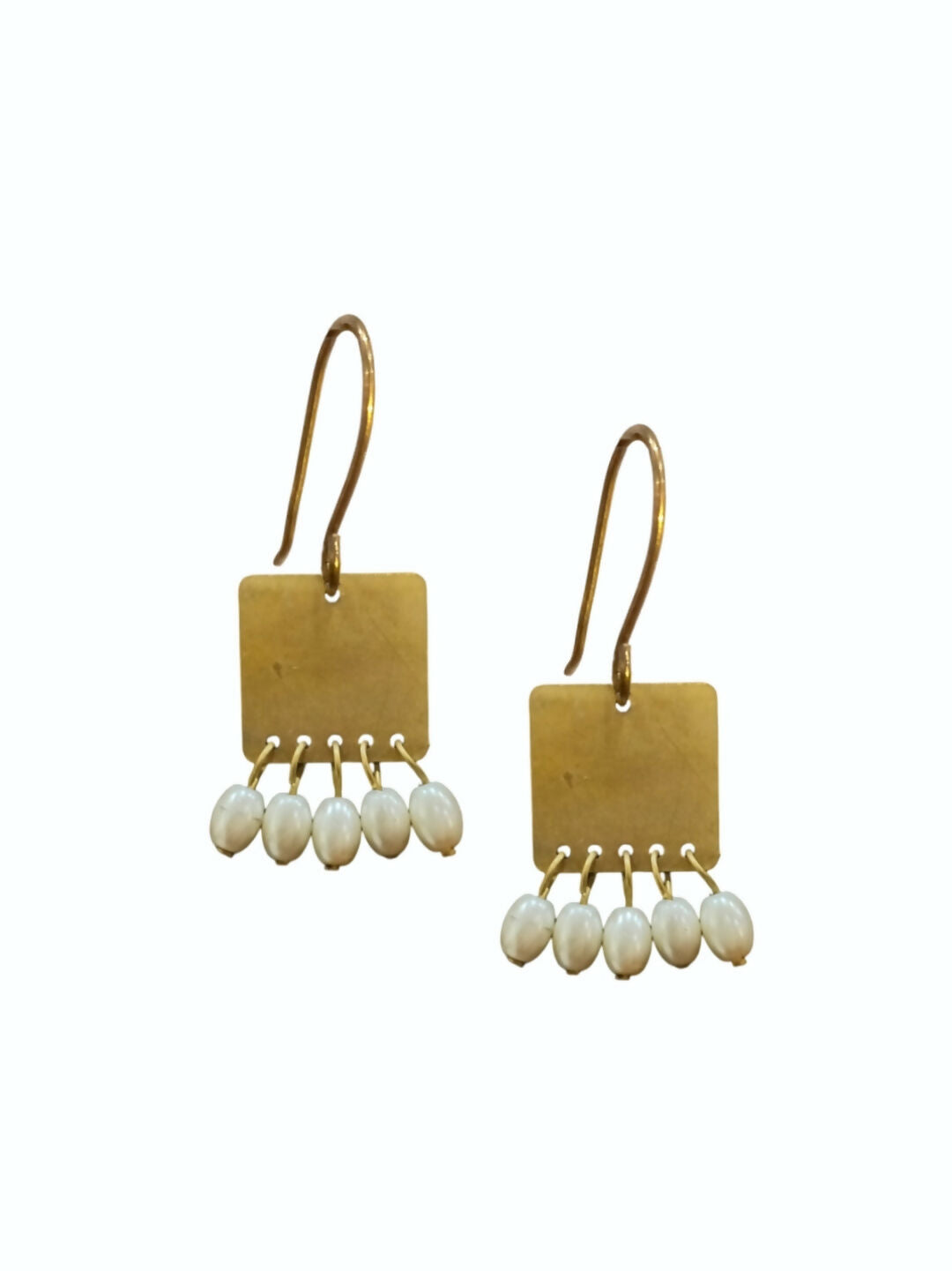 Square with Pearl Earrings: The square shape symbolizes stability, balance, and order, making these earrings a perfect choice for those who seek refinement and simplicity in their accessories. Whether worn with casual attire or paired with formal wear, they effortlessly elevate any ensemble with their understated allure. Hinging out from each piece are a group of radiant pearls, its lustrous surface adding a hint of opulence and sophistication to the design. The pearl's iridescent sheen contrasts beautifully with the warm tones of the brass, creating a captivating focal point that enhances the elegance of the earrings. Embrace the beauty of simplicity with these square-shaped brass earrings adorned with pearls, a versatile accessory that pairs effortlessly with any outfit and exudes timeless elegance in every detail. Whether you're a minimalist at heart or simply appreciate classic design with a touch of refinement, these earrings are sure to become a staple in your jewelry collection.
