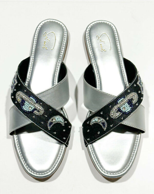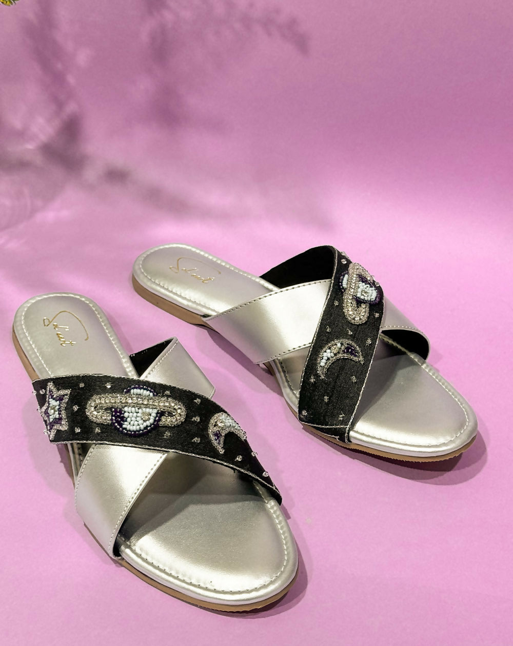 Introducing “Supernova,” a striking pair of sliders that combine comfort with celestial elegance. These unique sliders feature double crossed straps in a chic black and silver colour scheme, creating a stylish and versatile look. What sets “Supernova” apart is the intricate embroidery of celestial bodies adorning the straps, adding a touch of cosmic charm to your footwear. Perfect for casual outings or adding a bit of sparkle to your everyday attire, these sliders offer both fashion and function. Slip into “Supernova” and let your style shine like the stars.